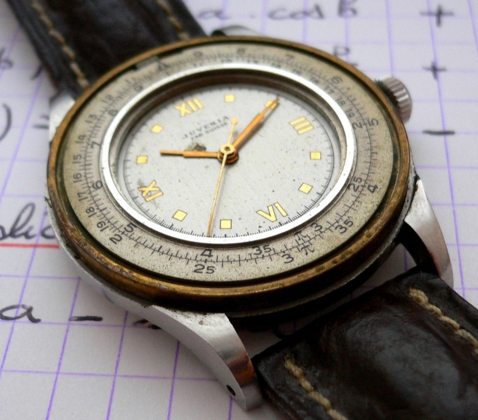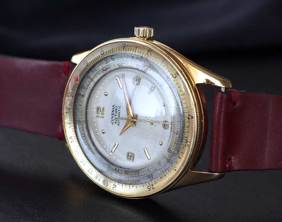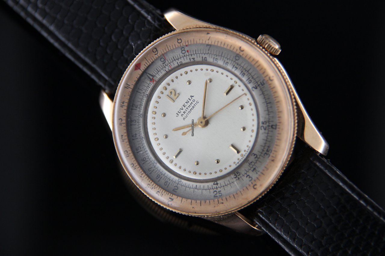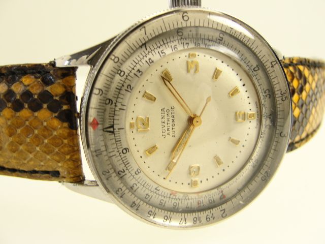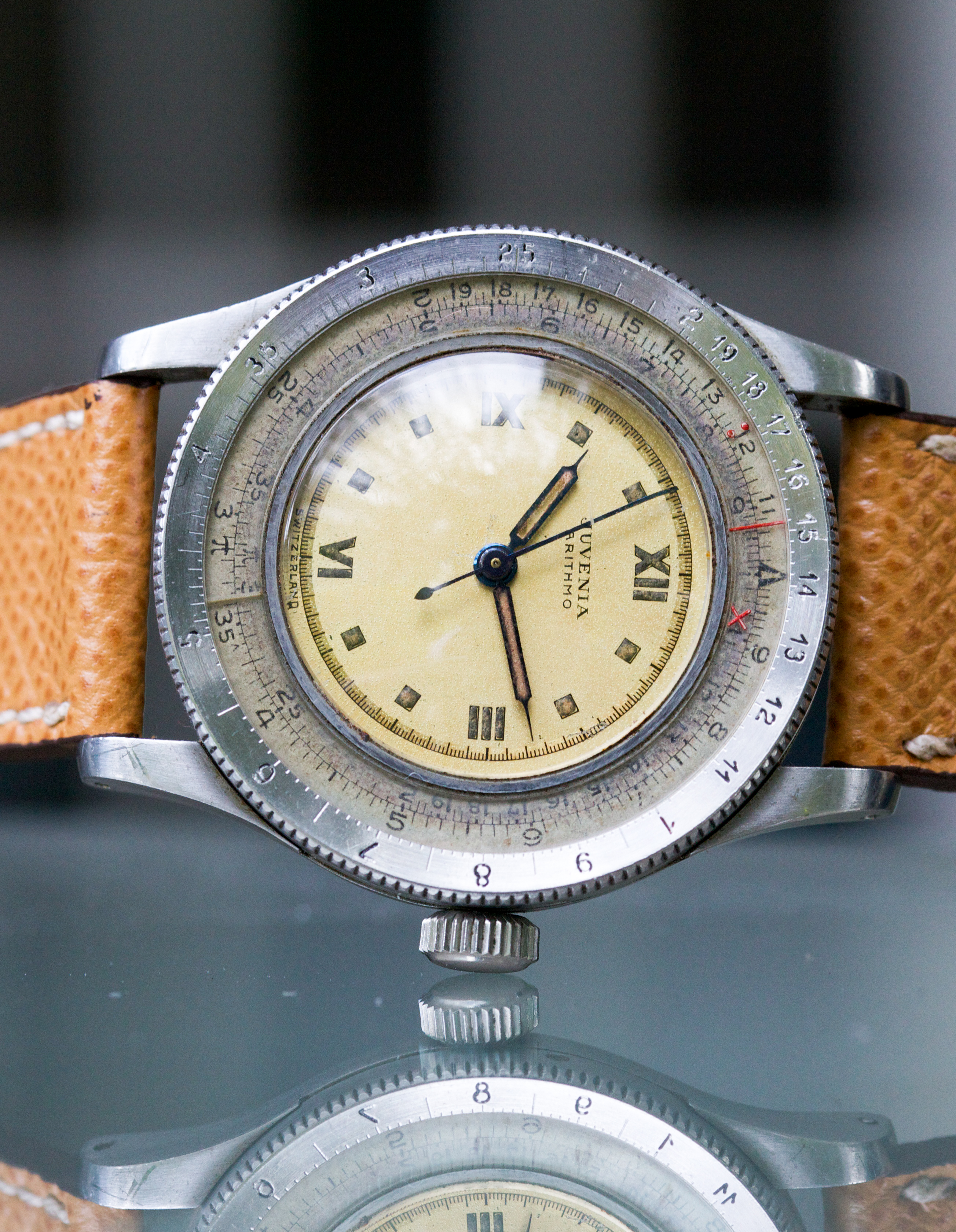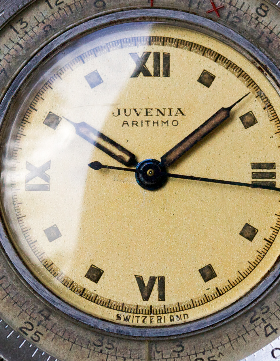 Introduit en 1945, le modèle Arithmo de Juvenia suit de quelques années à peine la sortie de la Breitling Chronomat (1941). Moins illustre que sa devancière, elle remplit la même fonction d’assistance aux ingénieurs et techniciens. Une montre intelligente et rare.
