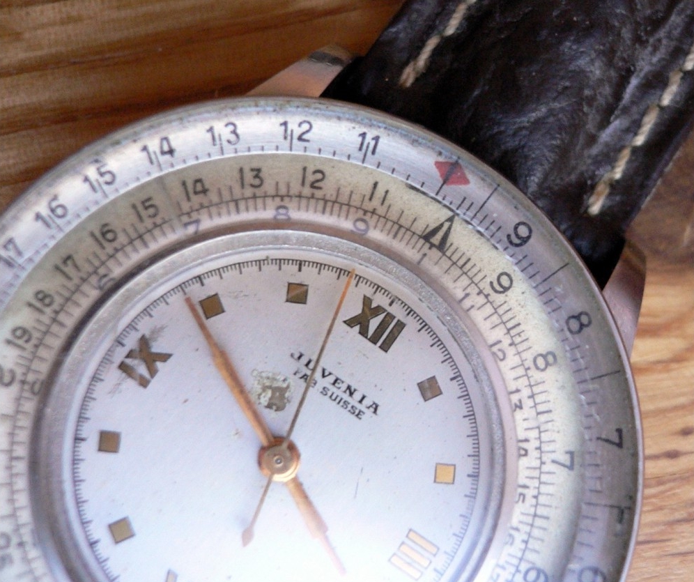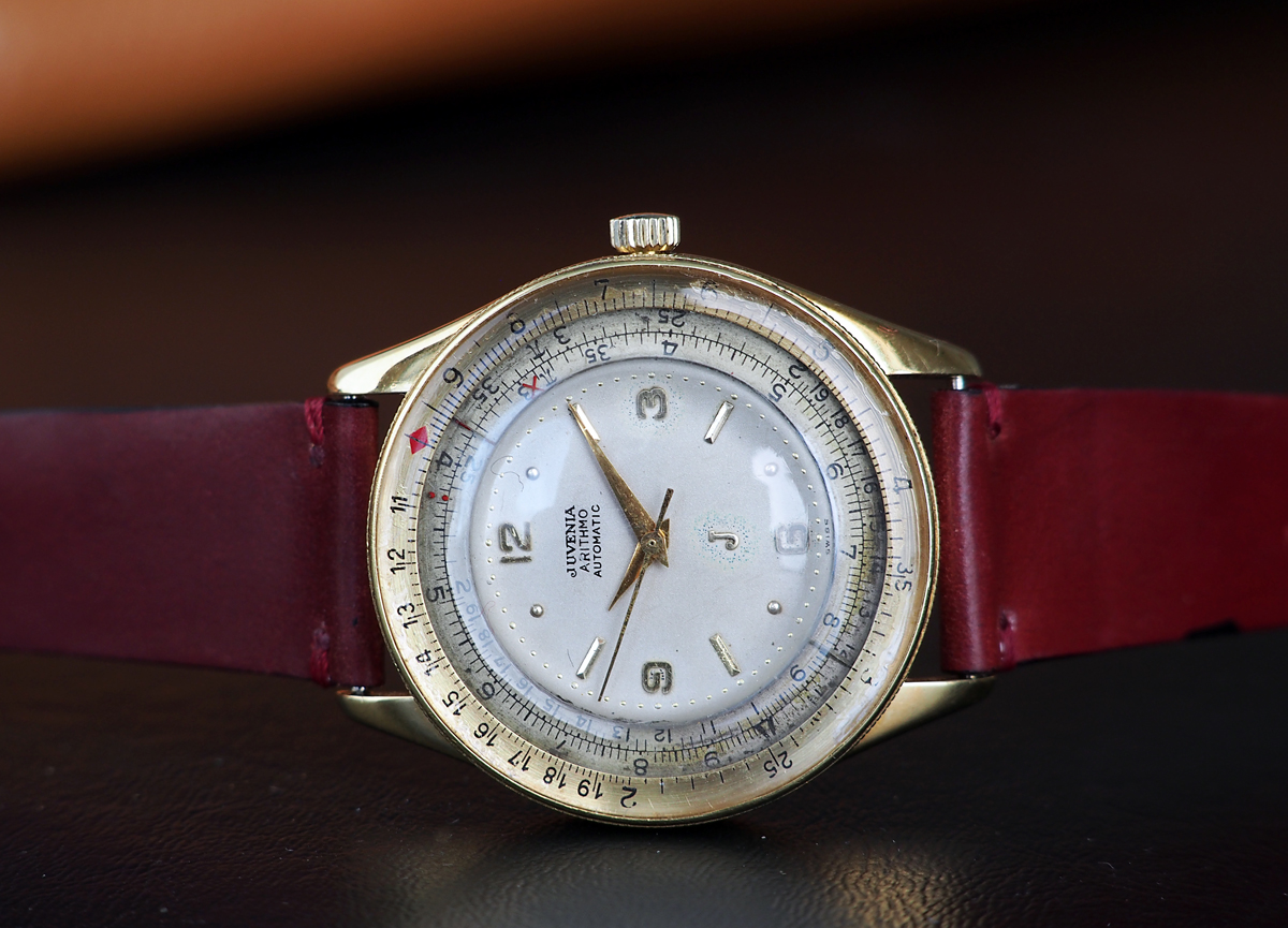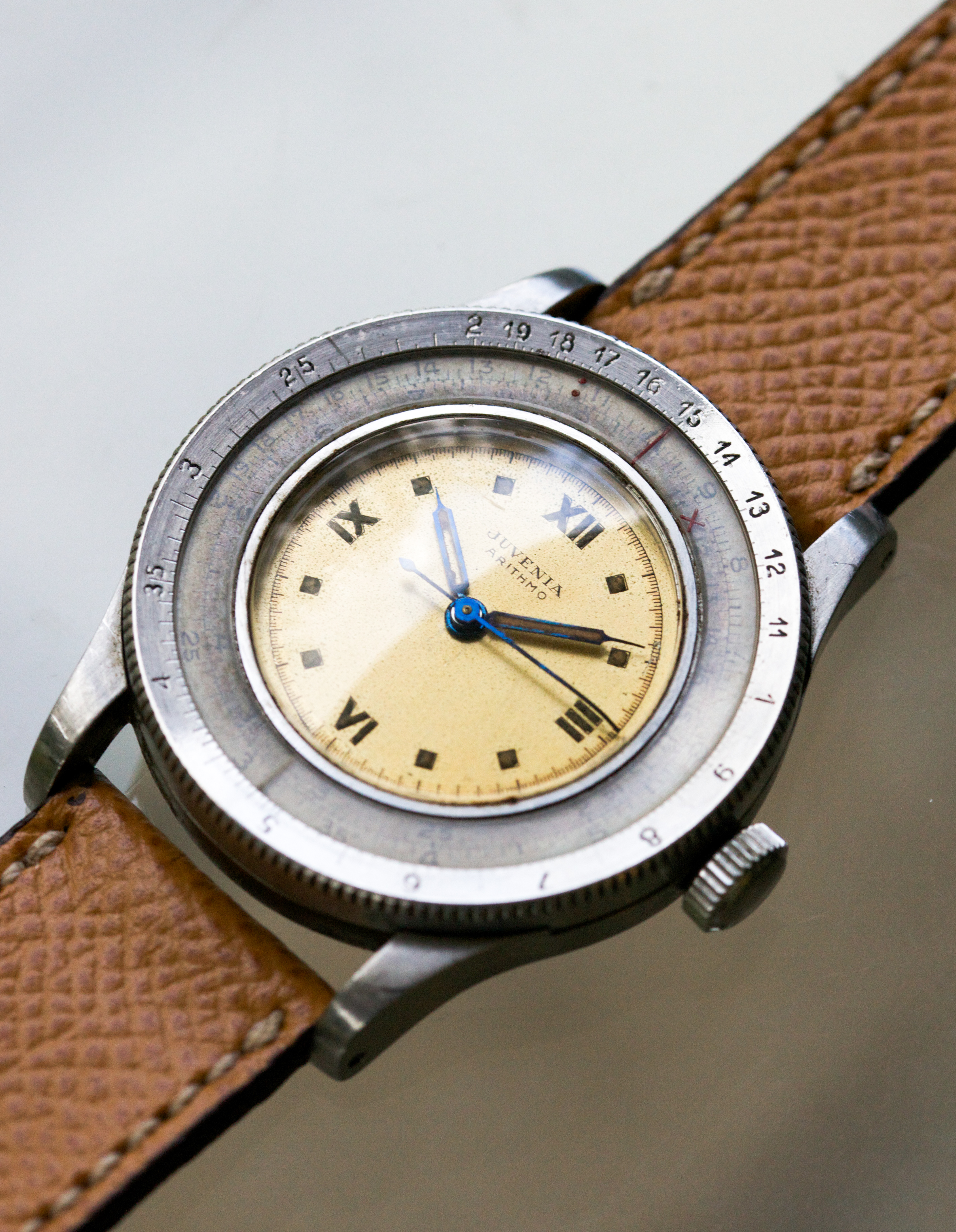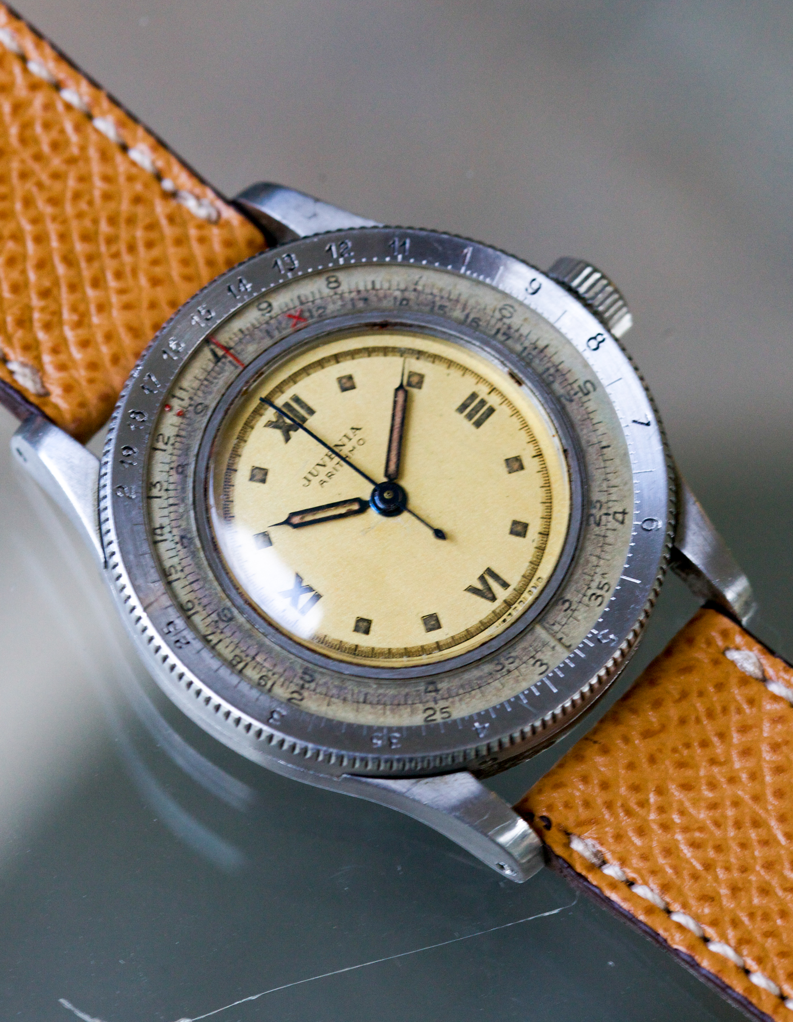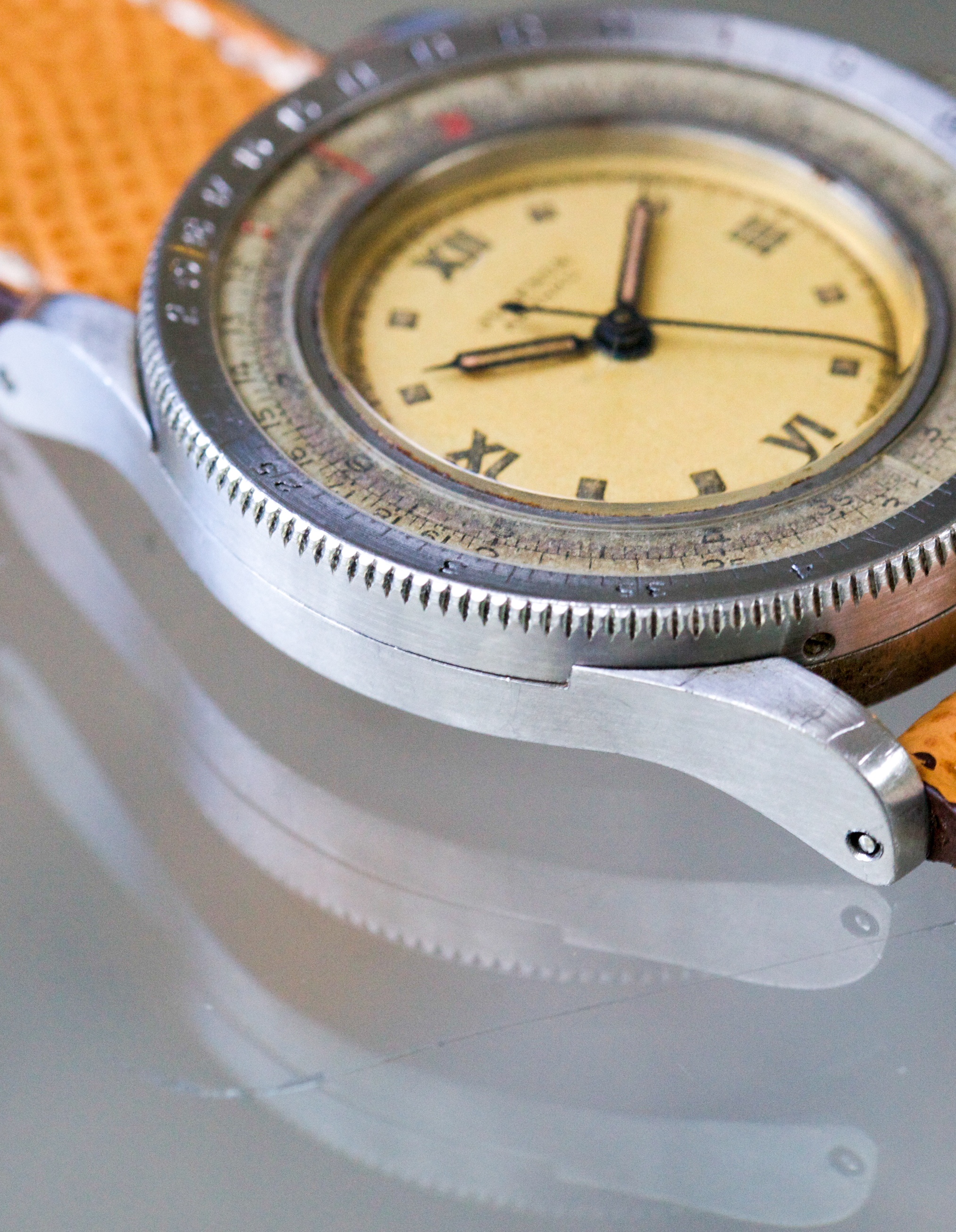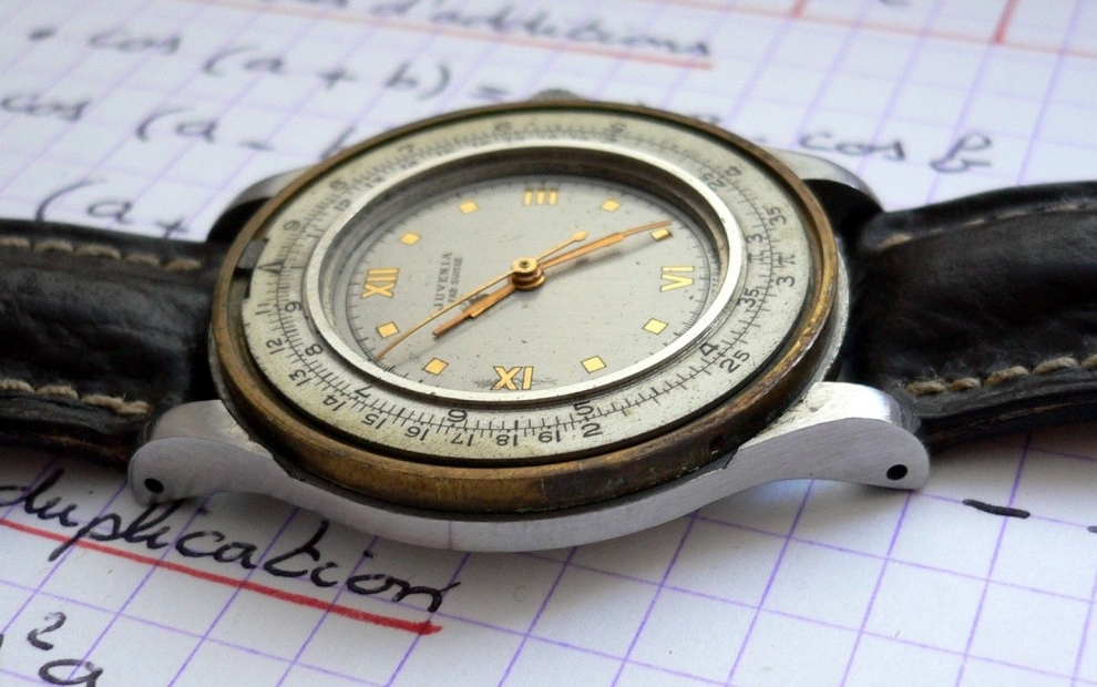Introduit en 1945, le modèle Arithmo de Juvenia suit de quelques années à peine la sortie de la Breitling Chronomat (1941). Moins illustre que sa devancière, elle remplit la même fonction d’assistance aux ingénieurs et techniciens. Une montre intelligente et rare.