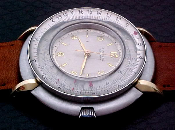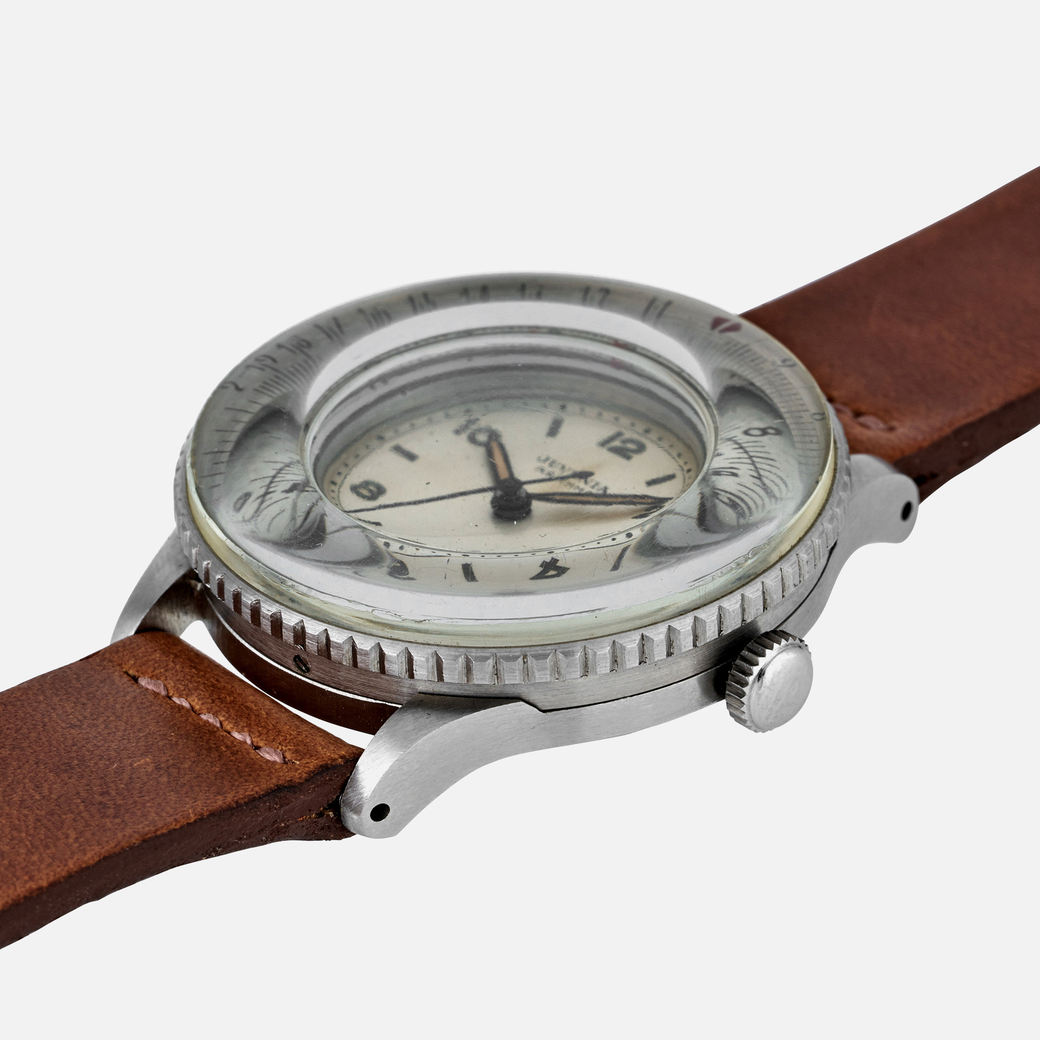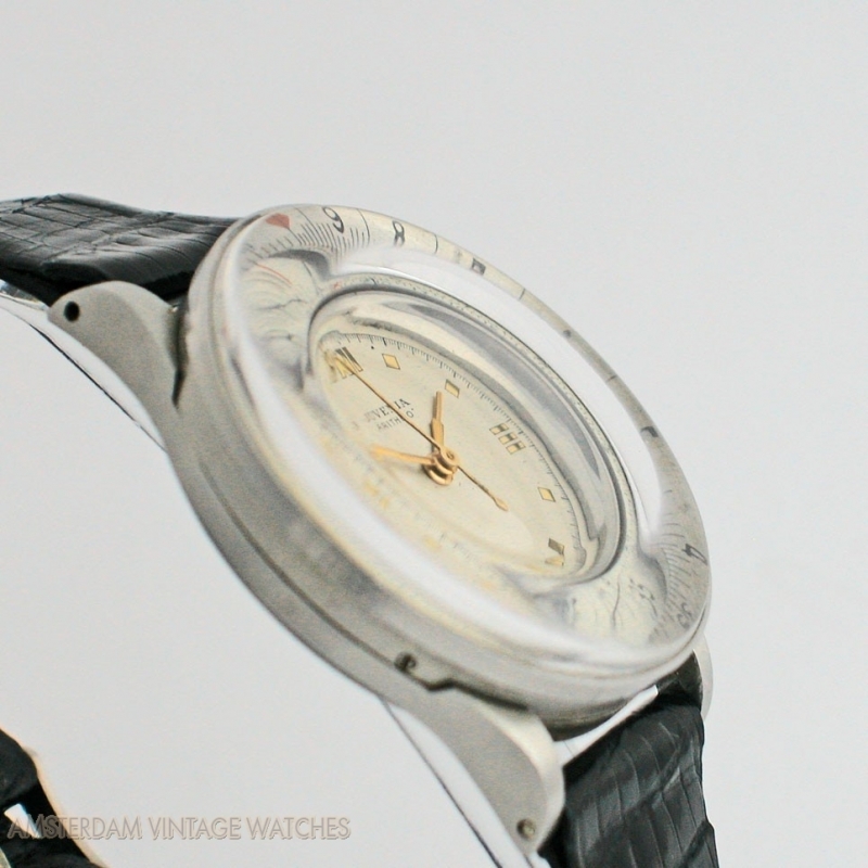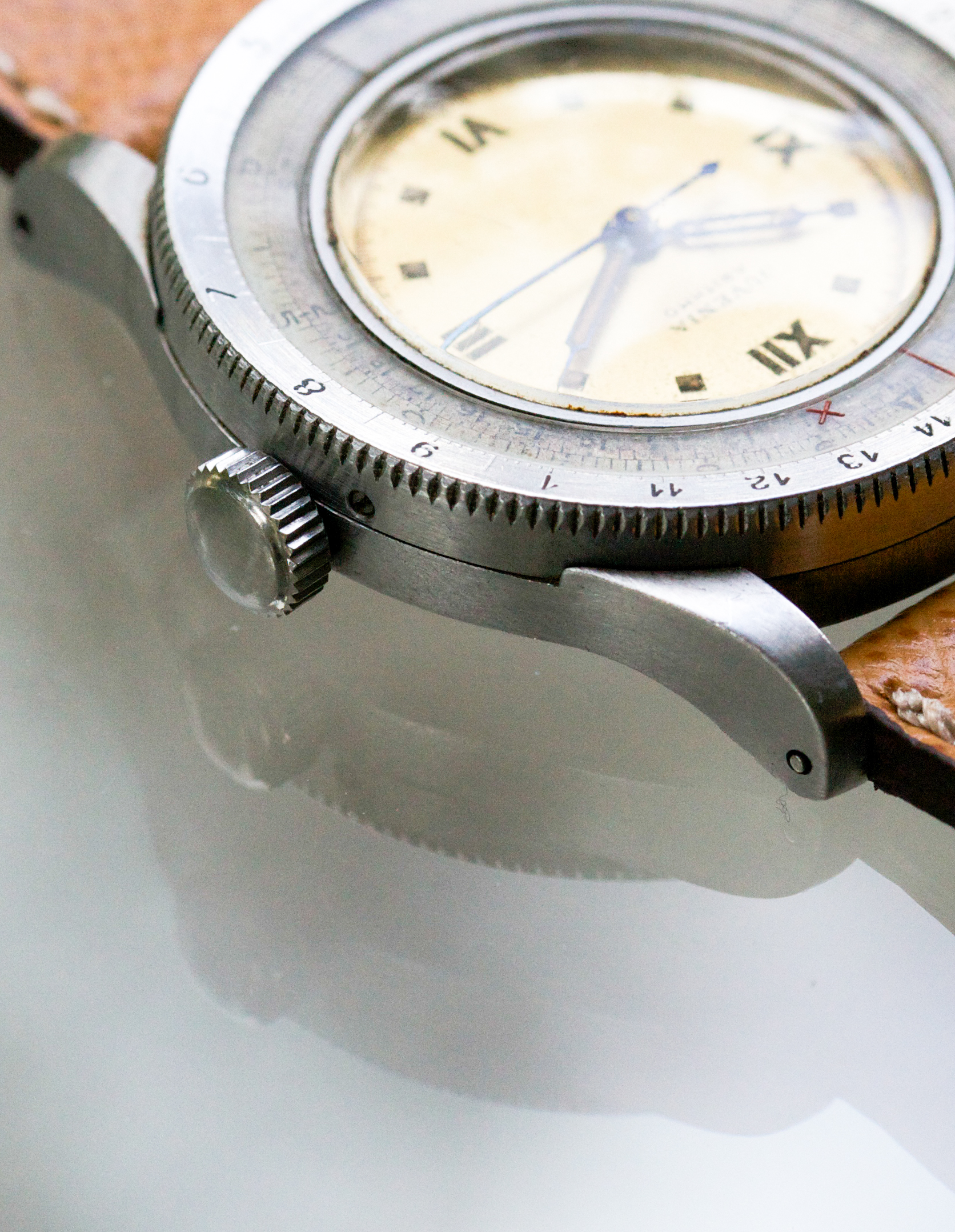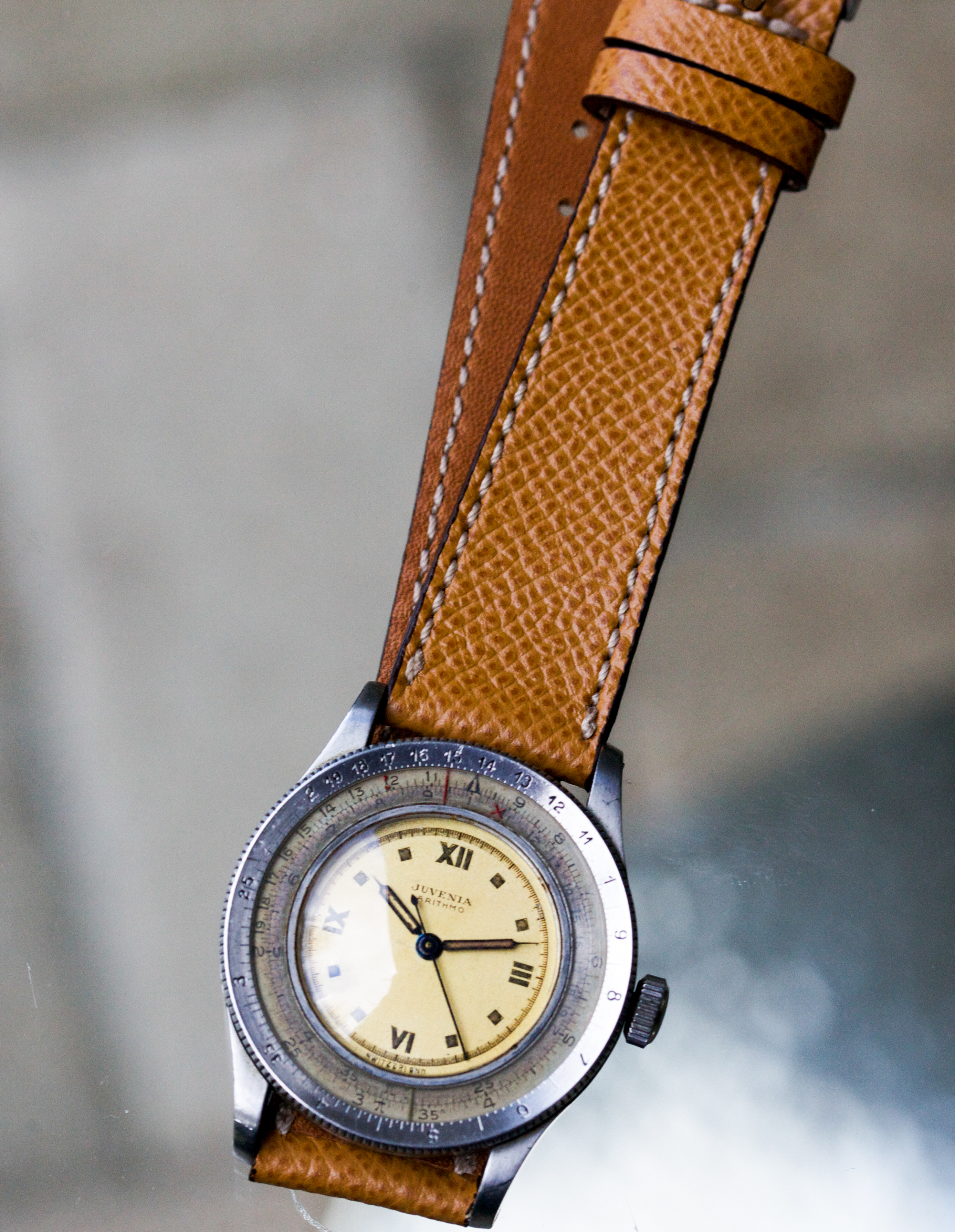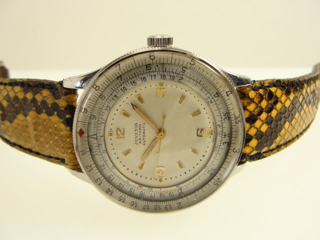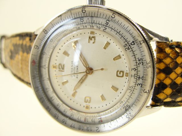 Introduit en 1945, le modèle Arithmo de Juvenia suit de quelques années à peine la sortie de la Breitling Chronomat (1941). Moins illustre que sa devancière, elle remplit la même fonction d’assistance aux ingénieurs et techniciens. Une montre intelligente et rare.