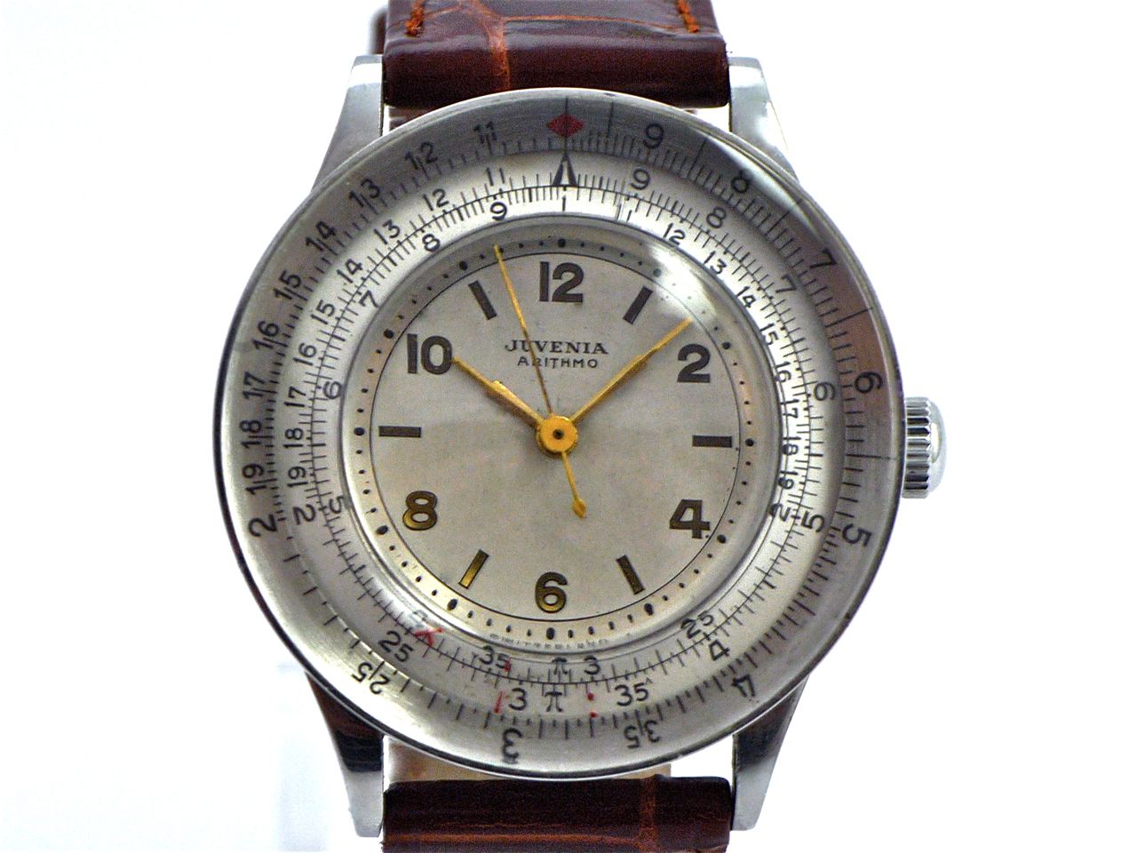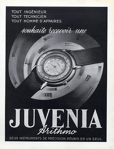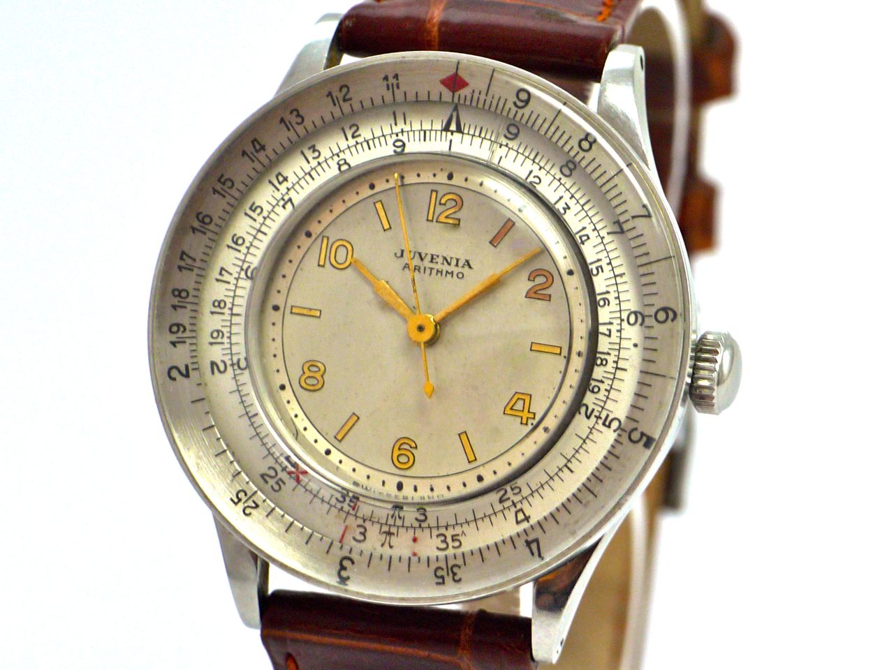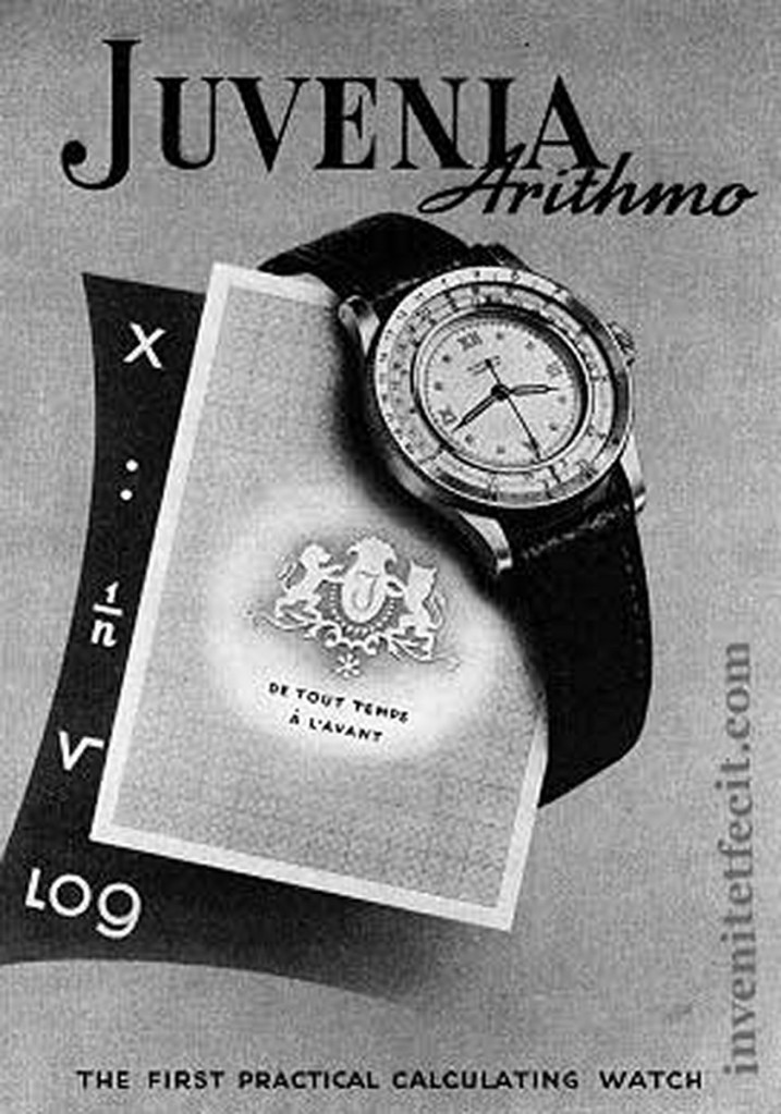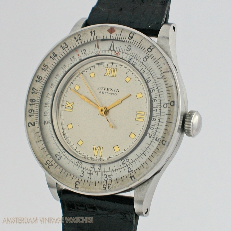 Une autre marque se lance sur ce marché de « niche » quelques années plus tard : Juvenia, maison horlogère fondée au début du siècle et plus portée sur le design que sur la technique pure. Nul doute que le succès de la Chronomat aura donné des idées à la marque pour élargir sa clientèle, principalement située dans la haute-bourgeoisie, au monde des sciences et de l’industrie. Ainsi donc naît l’Arithmo.