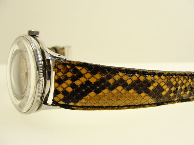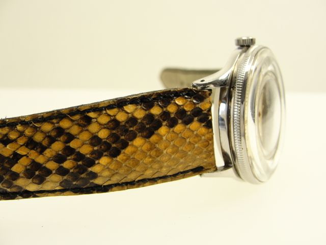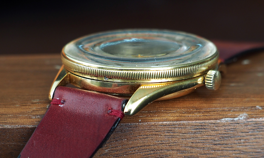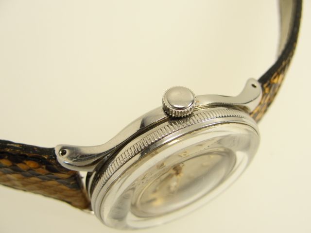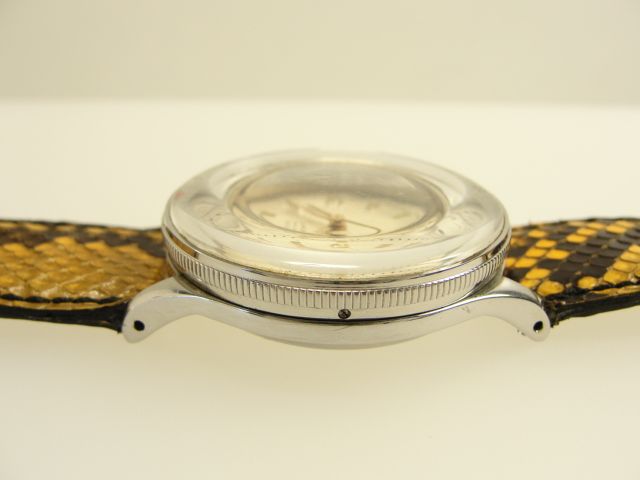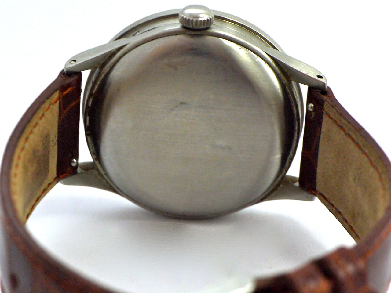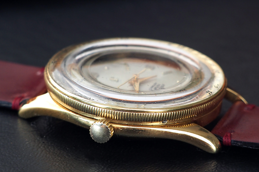 Ce troisième modèle, assurément postérieur, présente une combinaison cadran-aiguilles différente, avec des chiffres et index appliqués ainsi que des aiguilles « crayons ». Le style typique des années 1950. Réputé plus rare, il est en outre doté d’un mouvement automatique.