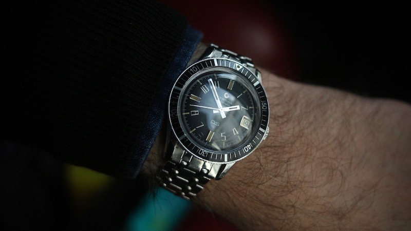 D’un diamètre de 39 mm à la lunette (37 mm à la boîte), notre DS s’illustre d’abord par un très élégant boîtier dont la finesse extérieure tranche avec la robustesse revendiquée : loin de l’épaisseur des Seamaster 300 et autres Submariner, la carrure est même plus fluette que celle des boîtiers Skindiver courants ! Vous noterez au passage l’élégante torsion des anses chanfreinées…