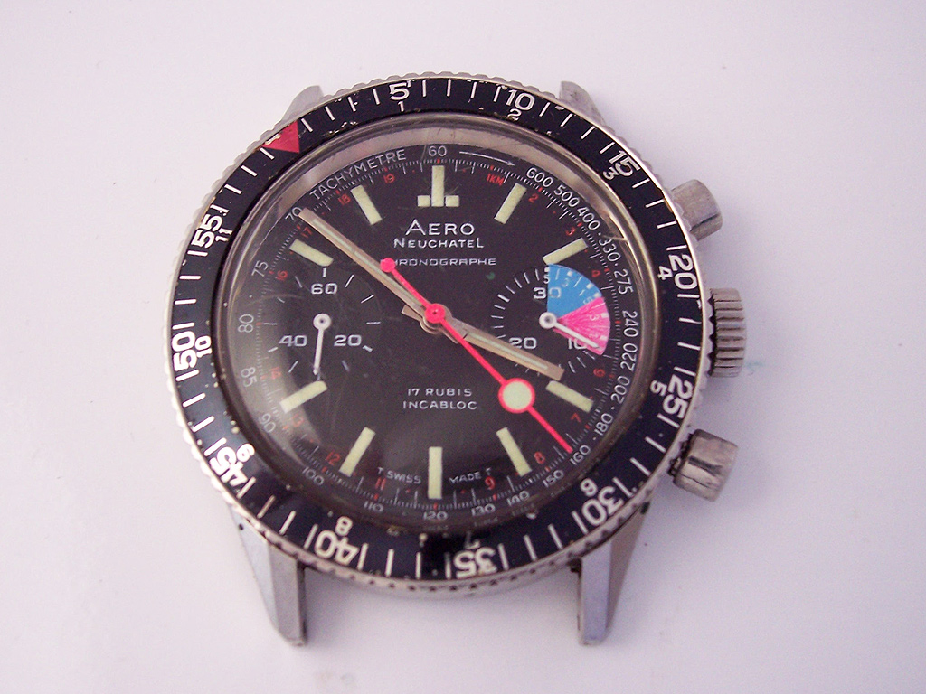 AERO NEUCHÂTEL, chronographe Valjoux 7733, circa 1973. Crédit : TheWatchSpotBlog. D’autres descriptions ici.