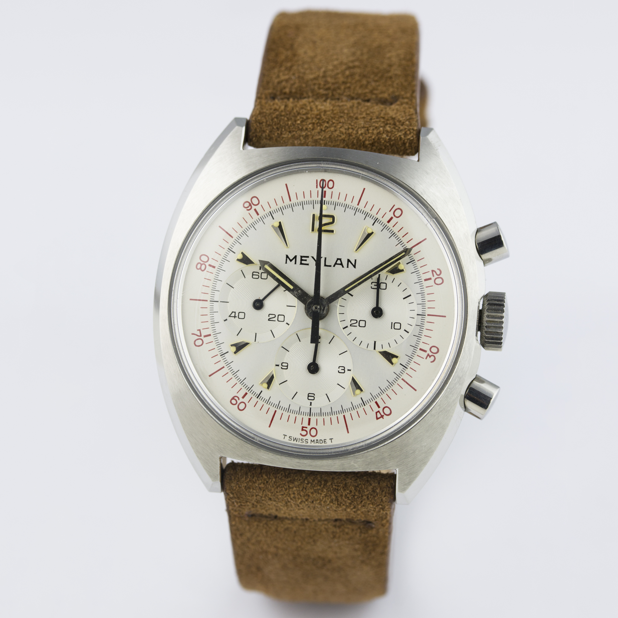 MEYLAN Decimal à boîtier « tonneau », cal. Lemania 1873, circa 1970. Crédit : Watches of Knightsbridge.