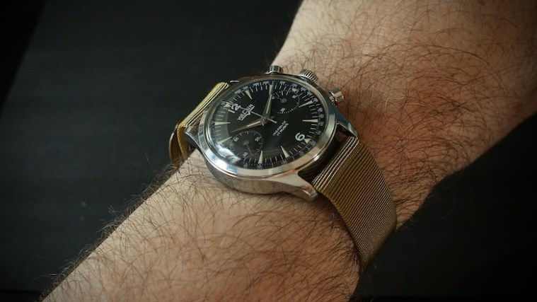 Usités dans la production horlogère au cours des années 1950-1960, ces index pointus font en outre songer à la première génération des Omega Seamaster 300 et Railmaster mais aussi à d’autres « trois aiguilles » de réputation plus modeste. Je ne suis pas sûr, en revanche, d’en avoir rencontré sur un autre cadran de chronographe.