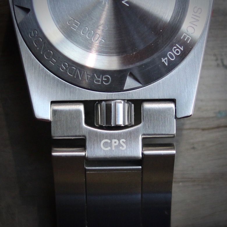 L’autre caractéristique, baptisée CPS (pour Crown Protection System), n’est autre que le génial système d’anse inventé dès le début des années 1960 par les concepteurs de la ZRC type II et empêchant, tout comme sur les Triton Spirotechnique, de porter la montre sans que la couronne soit parfaitement vissée et, a fortiori, de dévisser cette dernière sans retirer la montre du poignet. Pas besoin, comme sur certaines Panerai, de surcharger la montre et gêner le poignet avec une protection de couronne latérale : la fixation du bracelet remplit cette fonction de manière infaillible et la couronne à 6 heures ne gêne pas les mouvements du poignet.