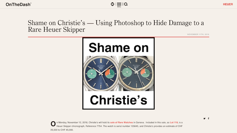 Mise à jour : à peine l’encre virtuelle de cet article a-t-elle eu le temps de sécher que Carlos S. signale sur Chronocentric un arrangement similaire avec la réalité, là encore sur un chronographe Heuer Skipper, et cette fois-ci dans le cadre d’une vente programmée ce mois-ci à Hongkong, chez Bonhams. La montre est ici. et la confrontation avec les vraies photos de la montre est assez édifiante. Peu à peu, on comprend mieux pourquoi les frais sont si élevés : ils servent moins à rémunérer le travail des experts chargés de contrôler les pièces qu’à payer des armées de graphistes pour trafiquer les photos…