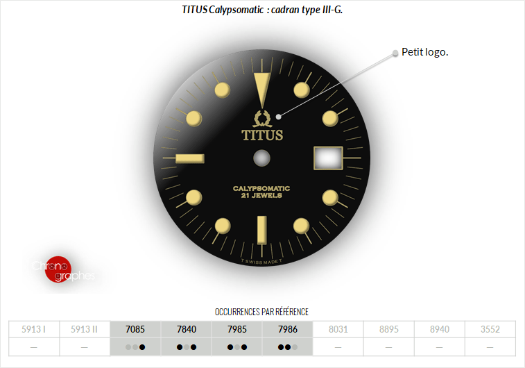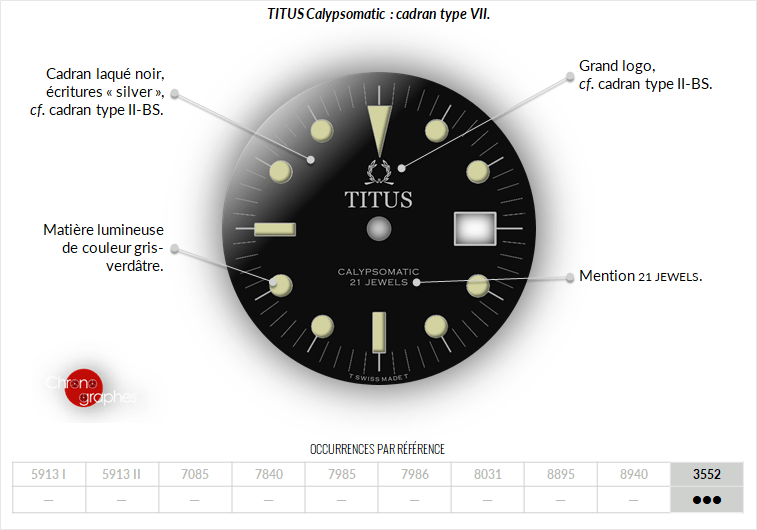 Le cadran type I, qui équipe la totalité des Titus Calypsomatic 5913 I — qu’elles portent la couronne « Super-Ocean » (5913 I/SO) ou la couronne Parmentier (5913 I/P) — se distingue notamment de tous les autres par la présence d’une étoile entre les mentions CALYPSOMATIC et 21 JEWELS. Cette étoile se retrouve sur quelques autres modèles produits à l’époque par la marque Titus.