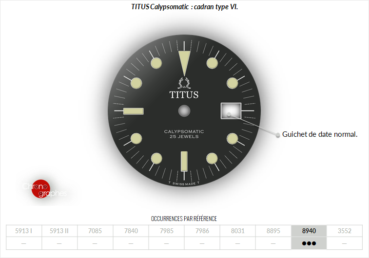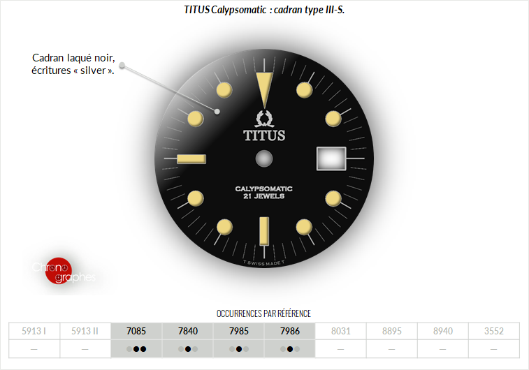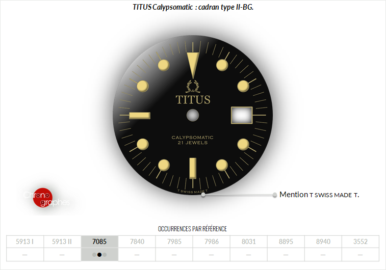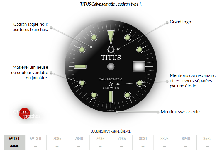 Le cadran type I, qui équipe la totalité des Titus Calypsomatic 5913 I — qu’elles portent la couronne « Super-Ocean » (5913 I/SO) ou la couronne Parmentier (5913 I/P) — se distingue notamment de tous les autres par la présence d’une étoile entre les mentions CALYPSOMATIC et 21 JEWELS. Cette étoile se retrouve sur quelques autres modèles produits à l’époque par la marque Titus.