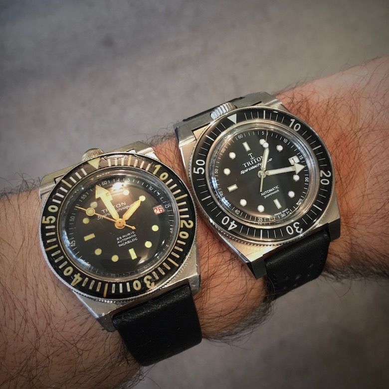 Grâce à la gentillesse de l’équipe de chez Émile Léon, rue Royale à Paris, distributeur de la marque Triton depuis la première heure, et à Triton Watches qui a mis à disposition l’unique prototype en circulation, voici une belle exclusivité : côte-à-côte avec sa devancière et inspiratrice, la future Triton Spirotechnique !