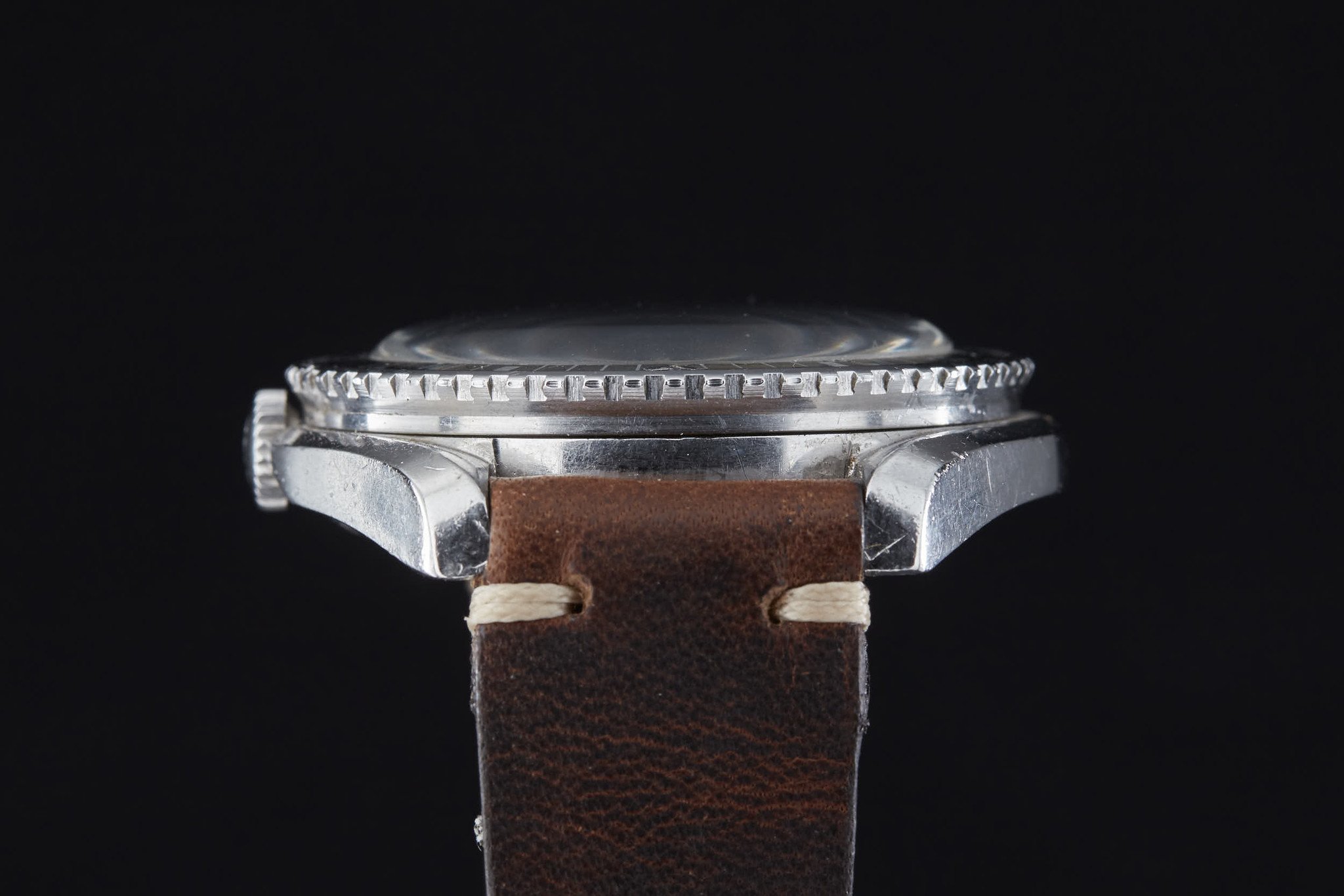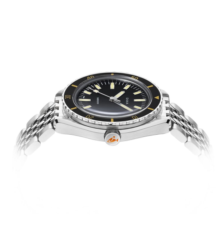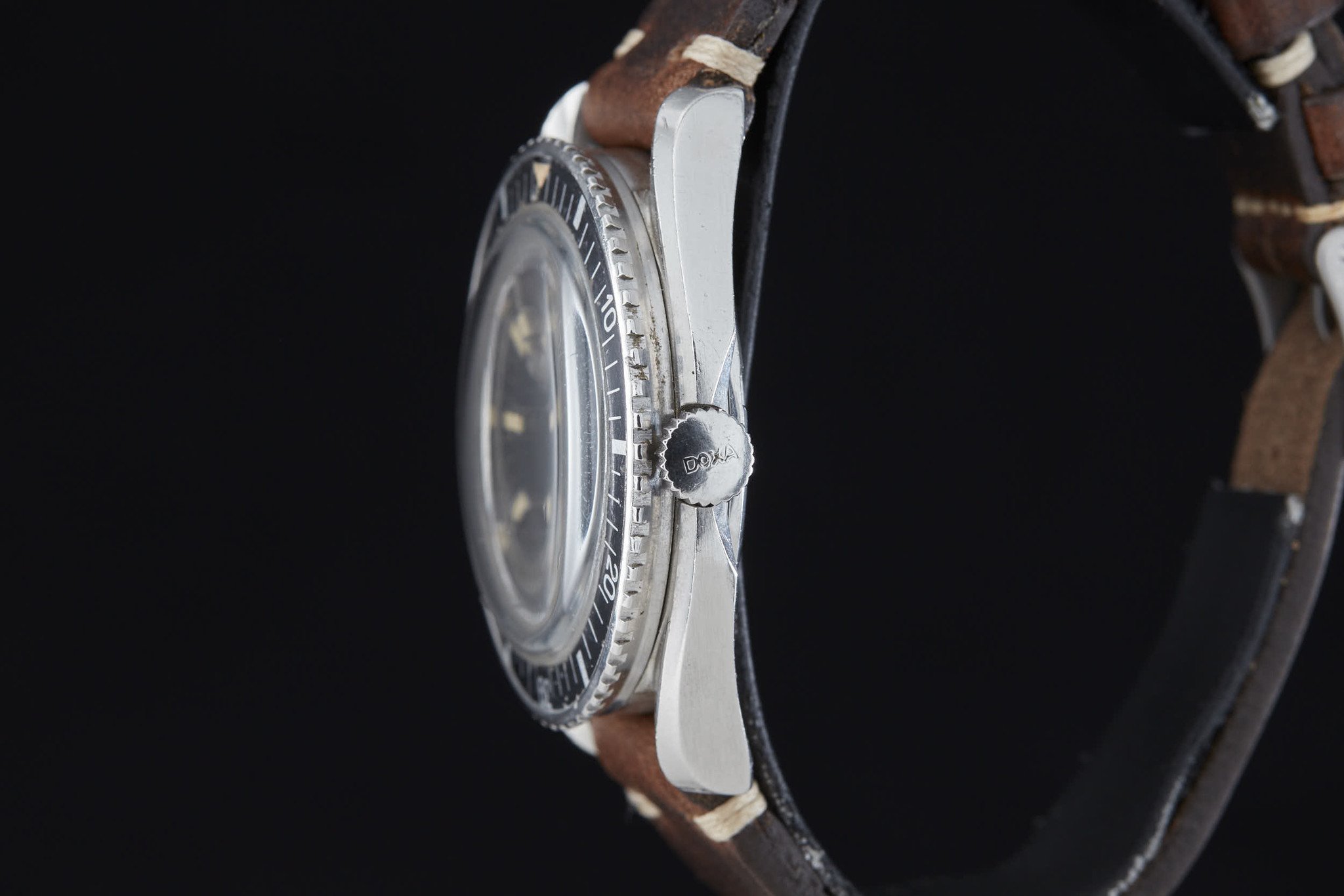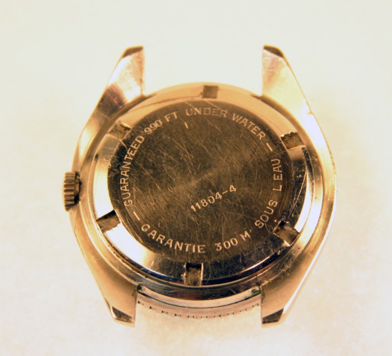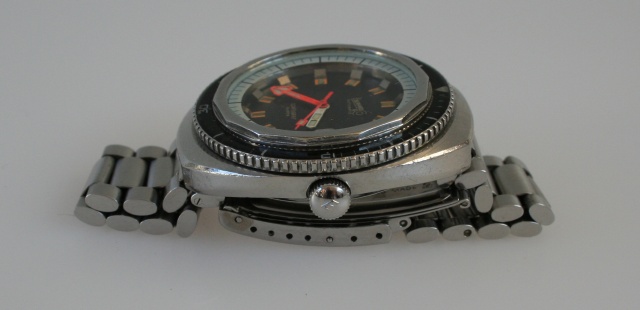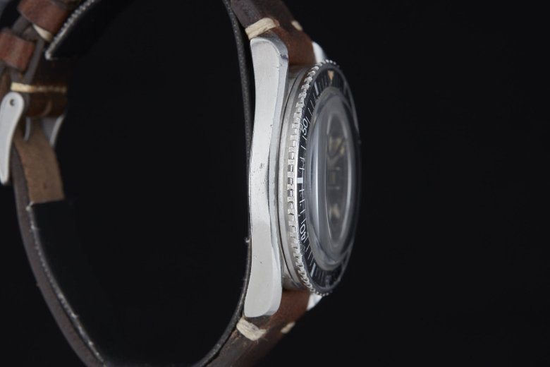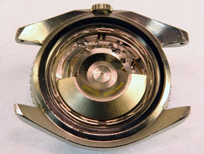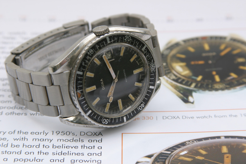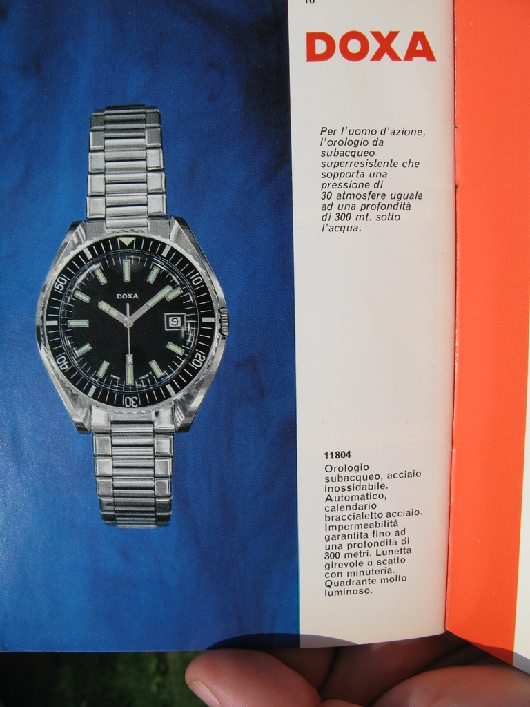 La première occurrence significative dans ce domaine particulier, redécouverte tardivement (en 2008 sur le forum WatchUSeek), est donc cette réf. 11804-4, qui date vraisemblablement du milieu des années 1960 si on la considère comme contemporaine de l’Eberhard Scafograf réf. 26013. Comme elle, la Doxa se présente dans une superbe carrure à anses « twistées » rompues à trois heures par une encoche protégeant la couronne, que l’on doit à Huguenin Frères, tout comme celle des Omega Seamaster 300. À l’évidence, il s’agit d’ailleurs de plus que d’une ressemblance : carrure, lunette et cadran sont en réalité semblables, de même que l’étanchéité annoncée à 300 mètres. Seuls diffèrent avec certitude le fond de boîte et la couronne.