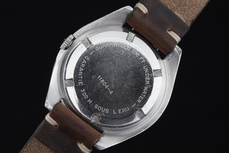 La Sub 300 Sharkhunter « no T » apparaîtra, elle, en 1967, soit approximativement un ou deux ans après cette 11804-4, rapidement suivie de la « 300 T ». Celle-ci plongera bien vite sa devancière dans l’oubli avec son cadran orange, sa lunette de décompression et ce bracelet grains-de-riz caractéristique, l’un des premiers à comporter une extension dépliable permettant de porter la montre directement au poignet ou par dessus la combinaison de plongée.