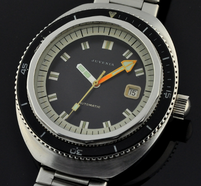 Eh bien sachez que, si l’Eberhard Scafograf 300 ne se cache plus derrière l’Omega Seamaster 300, deux autres marques se cachent derrière l’Eberhard Scafograf : Doxa et Juvenia ! L’une comme l’autre ont en effet commercialisé, à une échelle à l’évidence confidentielle, un modèle monté à partir de la même « banque d’organes » et, en particulier, la maison Huguenin Frères à qui l’on doit ce boîtier caractéristique à anses torsadées.
