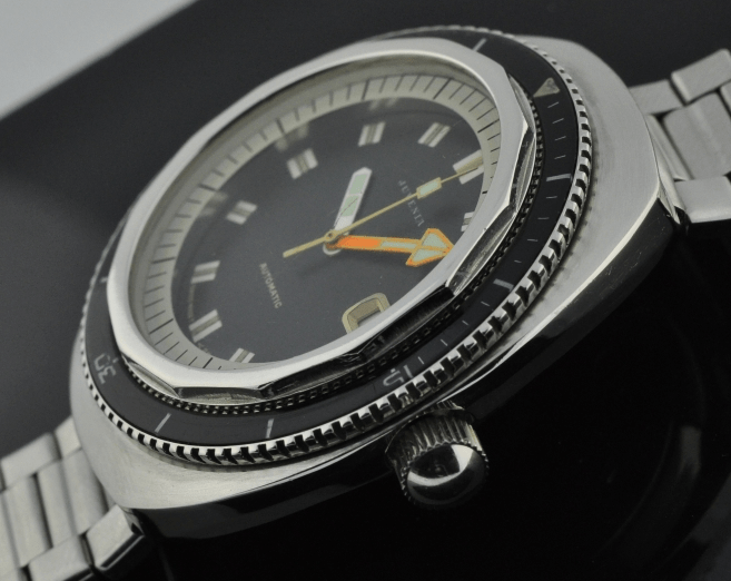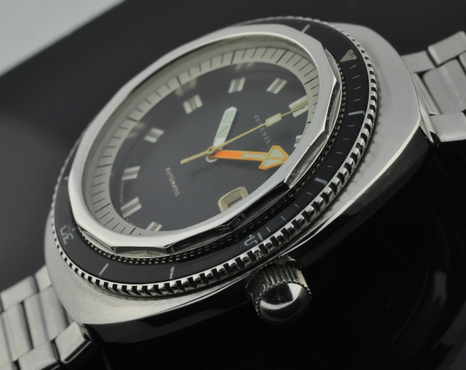L’exemplaire passé chez Analog/shift (ci-dessous) présente des aiguilles de remplacement, deux autres exemplaires avec le même cadran mais les aiguilles type « Scafograf » ayant été détectés (plus bas et ici).