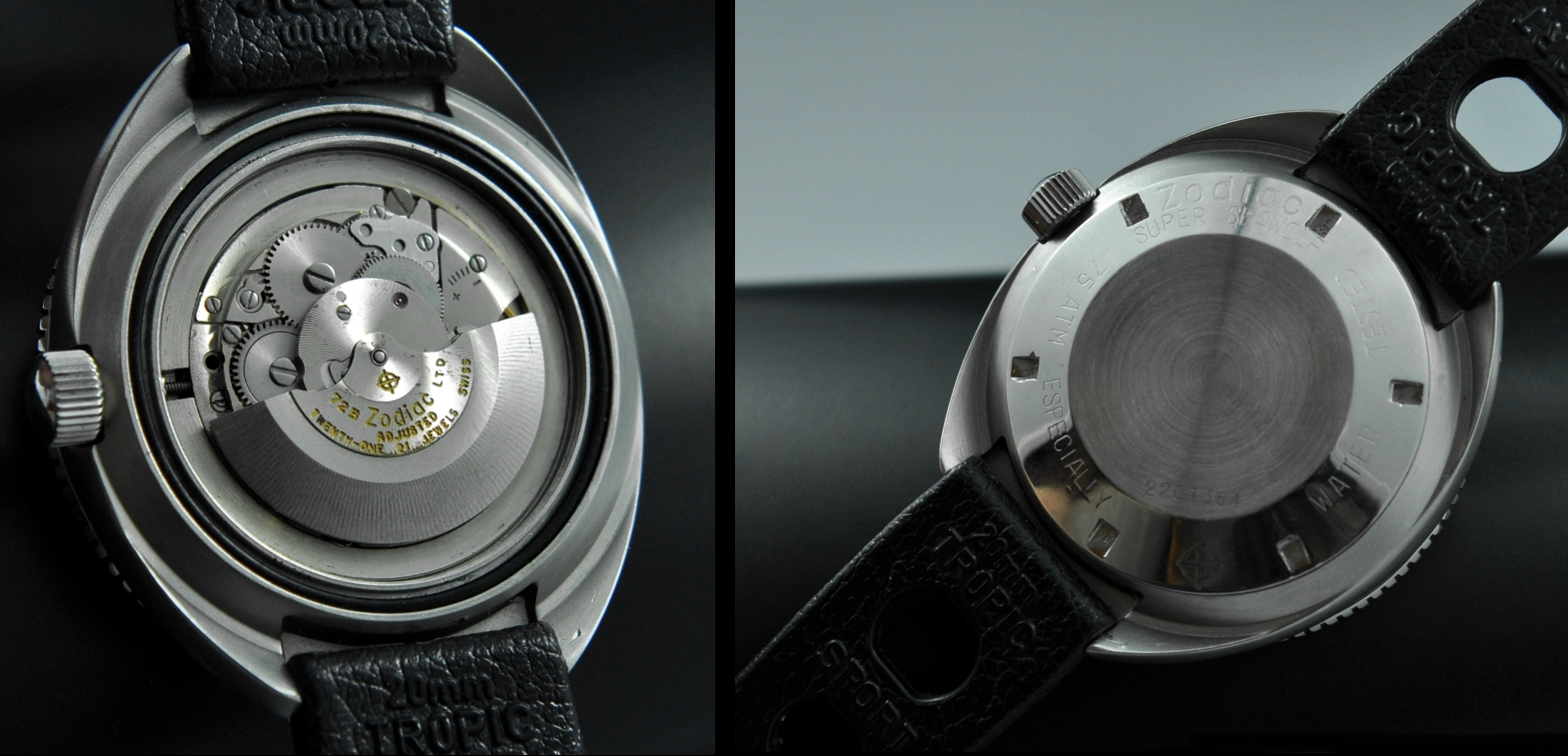 Pour référence, l’Eberhard Super Scafograf et la Zodiac Super Seawolf illustrent la présence abondante de gènes communs entre les modèles de ces différentes marques :