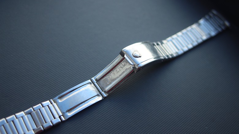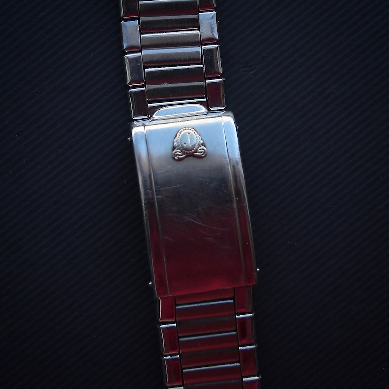 La Scafograf 300 est livrée avec un très beau bracelet en acier à boucle déployante dont l’aspect extérieur est proche de celui des premières Scafograf : la partie centrale des maillons rectangulaires est brossée et rainurée tandis que les extrémités sont polies. La boucle signée est identique à celle du modèle antérieur. Celui-ci est daté de I-65.