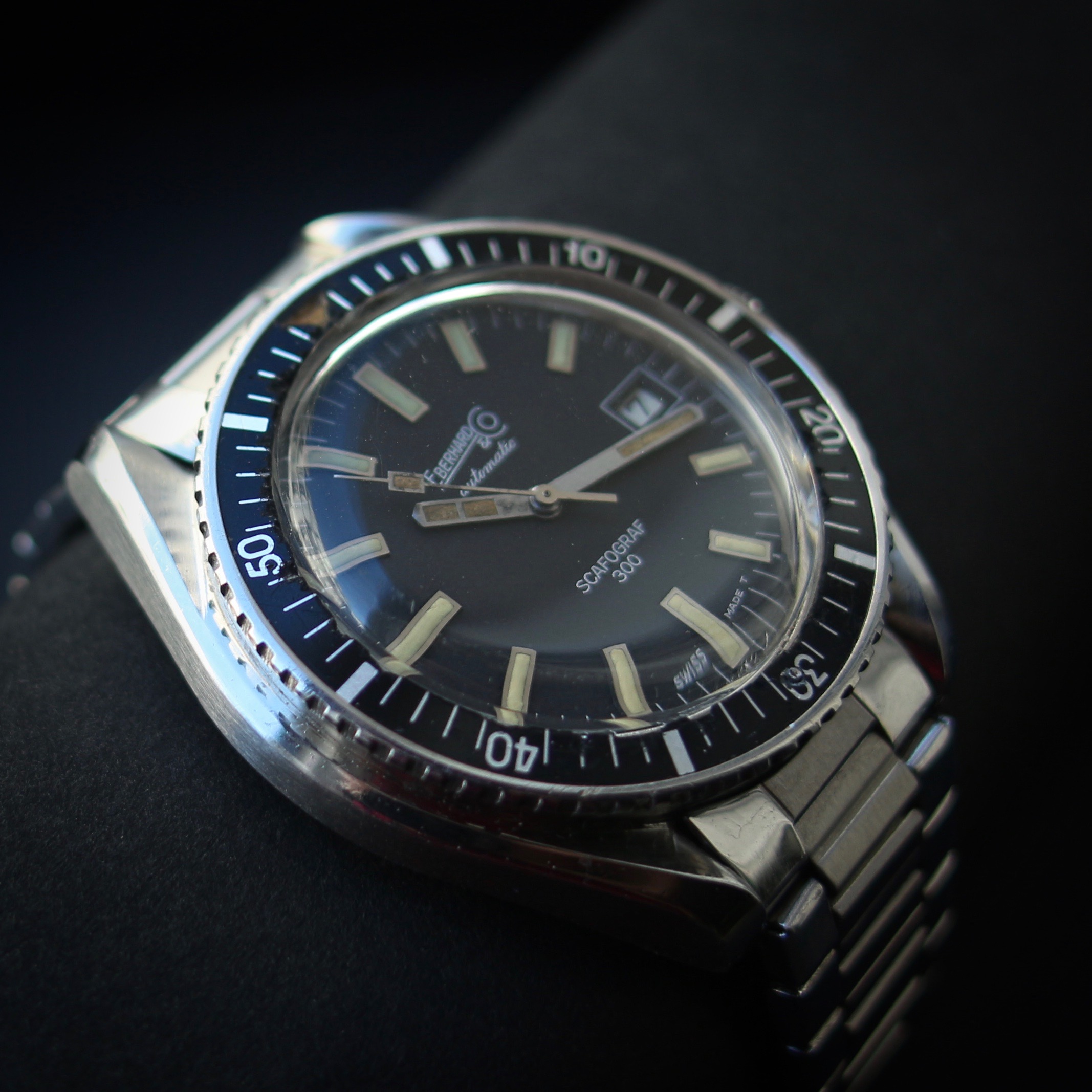 Délaissant les triangles inversés caractéristiques des premières générations, la Scafograf reçoit un cadran dans les standards de la seconde moitié des années 1960, avec de plus classiques index cerclés rectangulaires généreusement garnis de tritium.