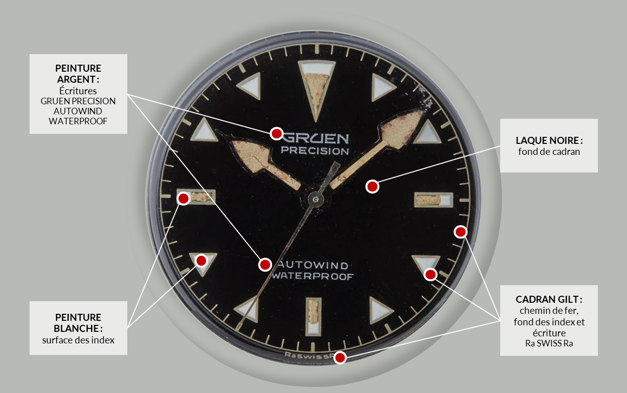 Les deux premiers types de cadrans portent l’indication SWISS seule à 6 heures. Sur le type 2, le graphisme des inscriptions évolue : notamment, les lettres composant GRUEN sont plus larges et plus serrées et la mention WATERPROOF est désormais plus longue que AUTOWIND.