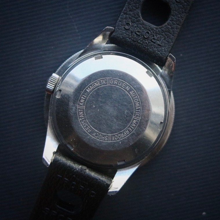 Vissé, le fond de boîte reste le même tout au long de la production. Sa face externe comporte quelques inscriptions classiques : GRUEN AUTOMATIC WATERPROOF SHOCK RESISTANT ANTI-MAGNETIC.