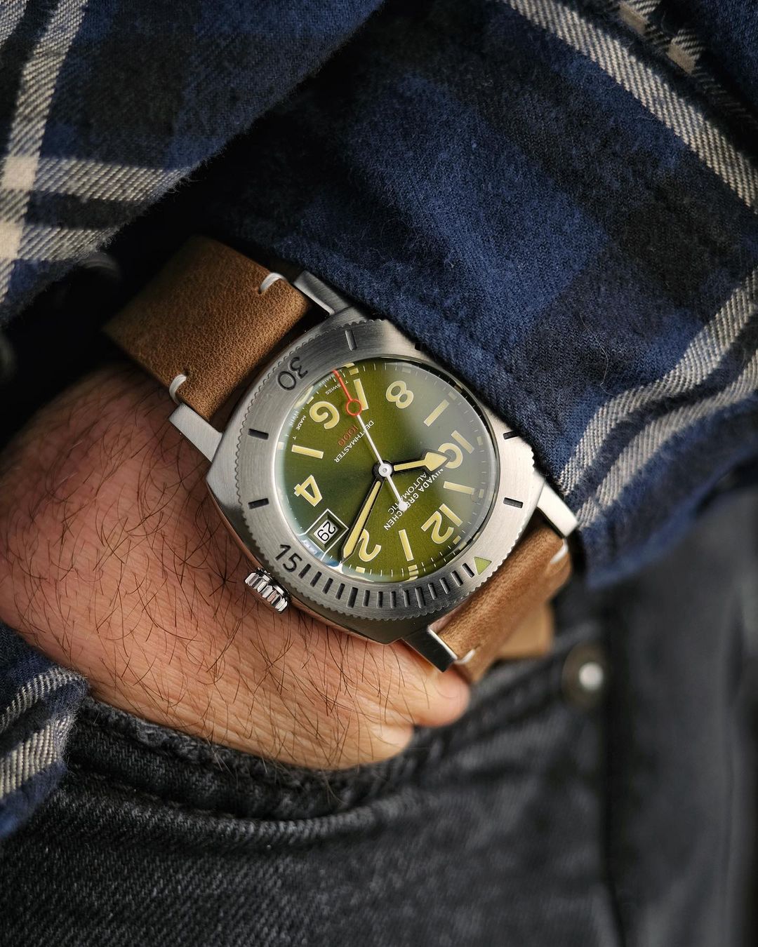 En outre, une variante particulière a été introduite sur le tard dans le projet : si les cadrans noirs sont d’aspect mat, Nivada Grenchen a finalement prévu aussi une version dotée d’un cadran vert soleillé aux nuances intéressantes :