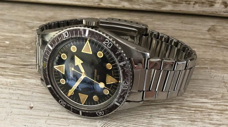 Voici un modèle que je n’espérais pas trouver un jour… Je l’avais découverte, comme sans doute quelques autres collectionneurs, au travers de la revue publiée par Matts sur le forum Montres mécaniques. Une montre de plongée « primitive » comme il les affectionne, mais pas comme les autres : avec 39 mm de diamètre, un cadran incroyable, une carrière confidentielle et l’extrême rareté qui en découle, la Scafograf 200 réunissait tous les ingrédients des montres « Graal ». Maintenant qu’elle est là, elle mérite bien une revue et même un peu plus que ça.