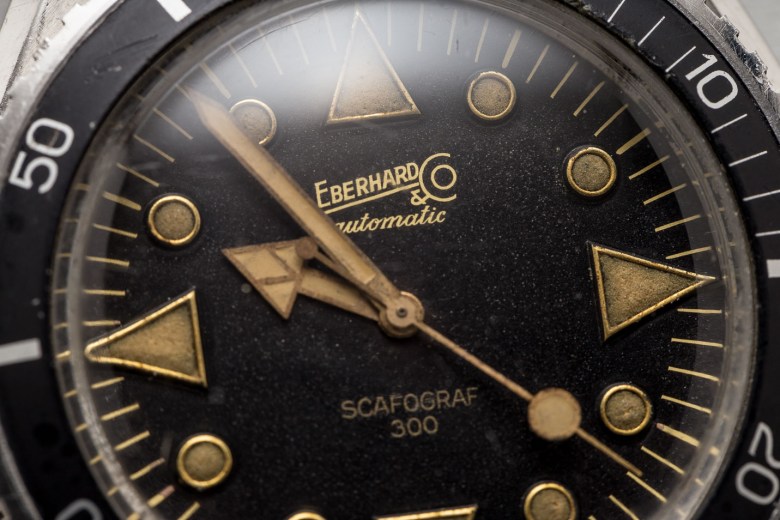 Unique en son genre, jusqu’à plus ample informé, cette Scafograf porte bien la référence 11545 et présente un cadran « sans date ». Magnifique, elle doit retenir l’attention car elle présente des caractéristiques étranges. La première, c’est la mention SCAFOGRAF 300 (et non SCAFOGRAF 200) sur le cadran et le fait que celle-ci, à la loupe, semble peinte par dessus le fond noir à la différence des autres écritures.