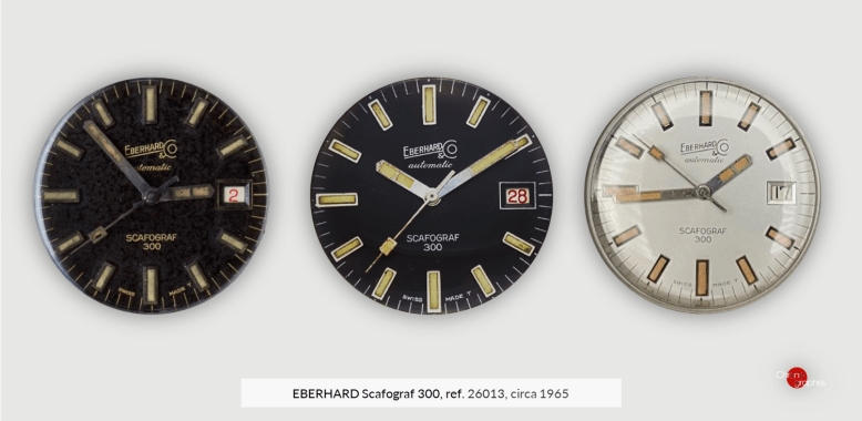 La Scafograf 300 réf. 26013 apparaît vers 1964-1965. à la voir, on voit immédiatement que l’intention d’Eberhard a été de conforter les qualités de la version précédente (réf. 11706) tout en procédant à un sérieux « lifting » pour la mettre au goût de l’époque, notamment en adoptant des index bâtons (d’où l’appellation « stick indexes »).
