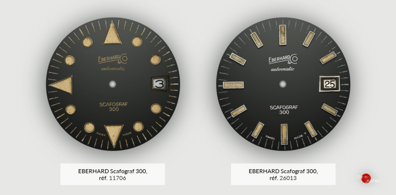 Détail pittoresque : en passant aux « Stick Indexes », Eberhard retenu un guichet de date rectangulaire (ci-dessous, à droite), cohérent avec le design du nouveau cadran, à la place du guichet trapézoïdal de la version précédente (ci-dessous, à gauche), mais ne s’est pas soucié de faire modifier les disques dateurs… Or les chiffres y étaient imprimés en perspective (plus grands vers l’extérieur) afin de suivre la forme de la fenêtre. Moralité, s’ils apparaissent de manière un peu comique sur votre Scafograf réf. 26013, vous n’avez ni besoin de lunettes ni d’arrêter de boire : c’est d’origine !