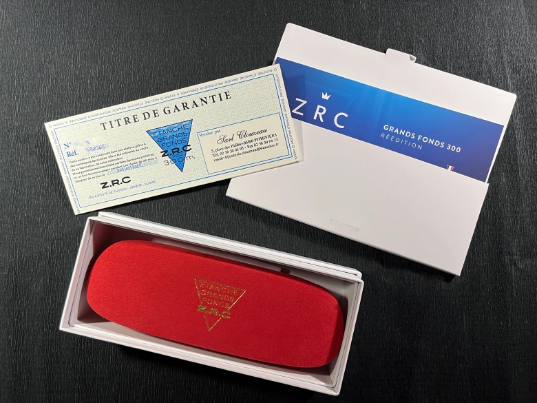 D’emblée, la taille et l’aspect de la boîte instaurent une différence par rapport aux gros coffrets qui abritent les Grands-Fonds 300. ZRC a adopté un parti-pris de simplicité, comme un écho de la vocation de montre-outil de la Grands-Fonds d’origine, qui ne s’embarrassait pas d’excès d’atours. Autre clin d’œil sympathique aux nostalgiques, la carte de garantie reprend les codes graphiques de celle des années 1960.