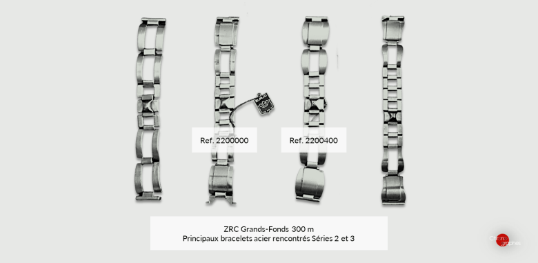 Quatre types de bracelets acier se rencontrent sur la Grands-Fonds 300 m. La référence 2200000 est de loin la plus courante. Dans leur état d’origine, il est composé d’une pièce dotée de deux lames extensibles renfermant des ressorts permettant de porter la montre sur une combinaison de plongée sans réglage particulier. Il est livré avec de nombreux maillons rectangulaires reliés par des pièces amovibles qui facilitent la mise à la taille.
