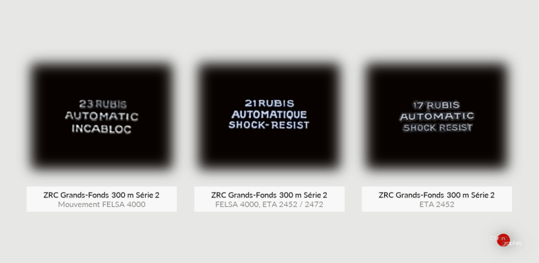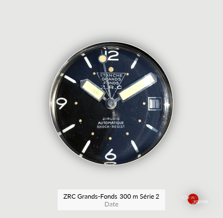 La Grands-Fonds Série 2 est d’abord équipée du même calibre Felsa 4000 que la Série 1. Dans un second temps, ZRC dote la Série 2 d’un très classique mouvement ETA, calibre 2452, permettant d’ouvrir un guichet de date à trois heures. Difficile, en revanche, de savoir à quel moment cette version est apparue et si elle a cohabité avec la sans-date. Attention, on trouve aussi des sans-date pourvues de mouvements ETA 2452 ou 2472 mais il est peu probable que ce montage soit d’origine.