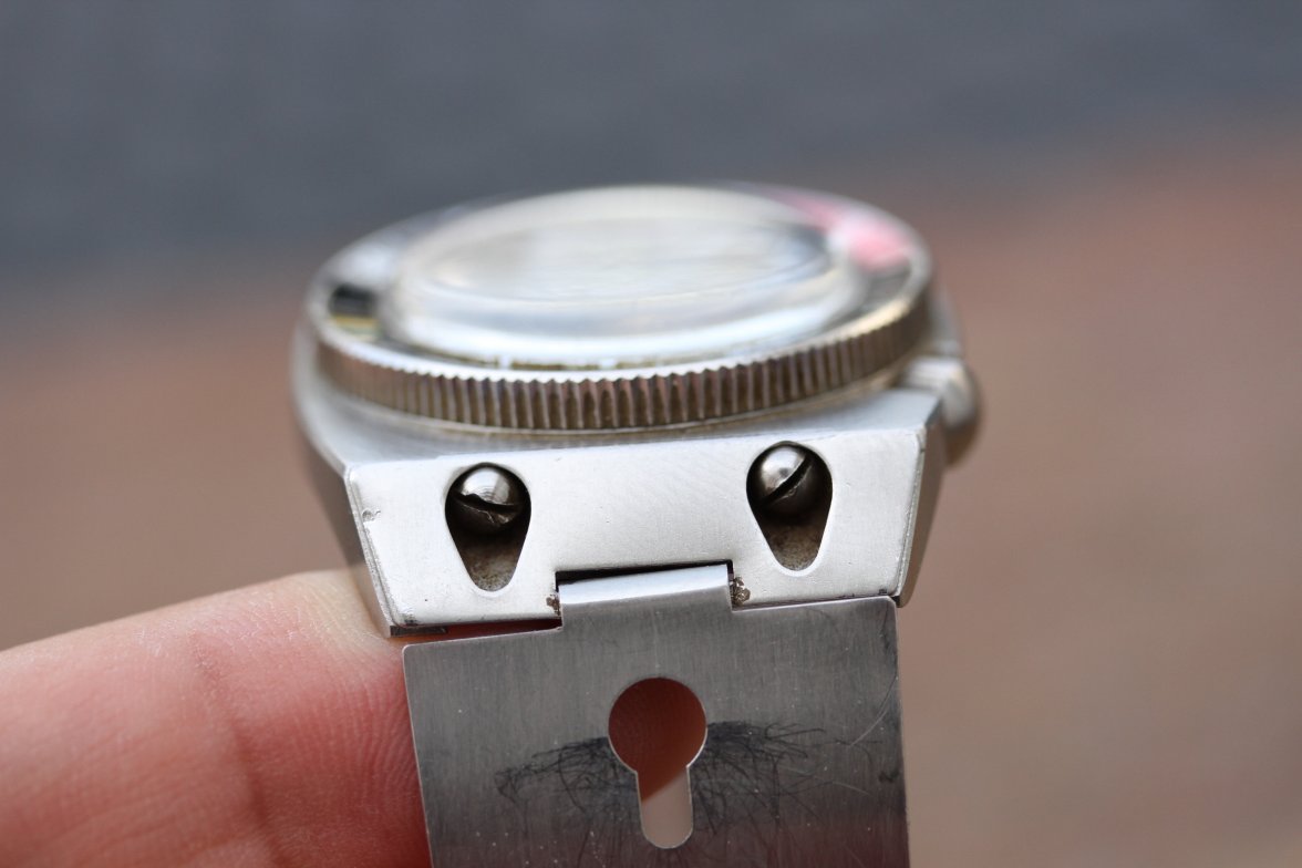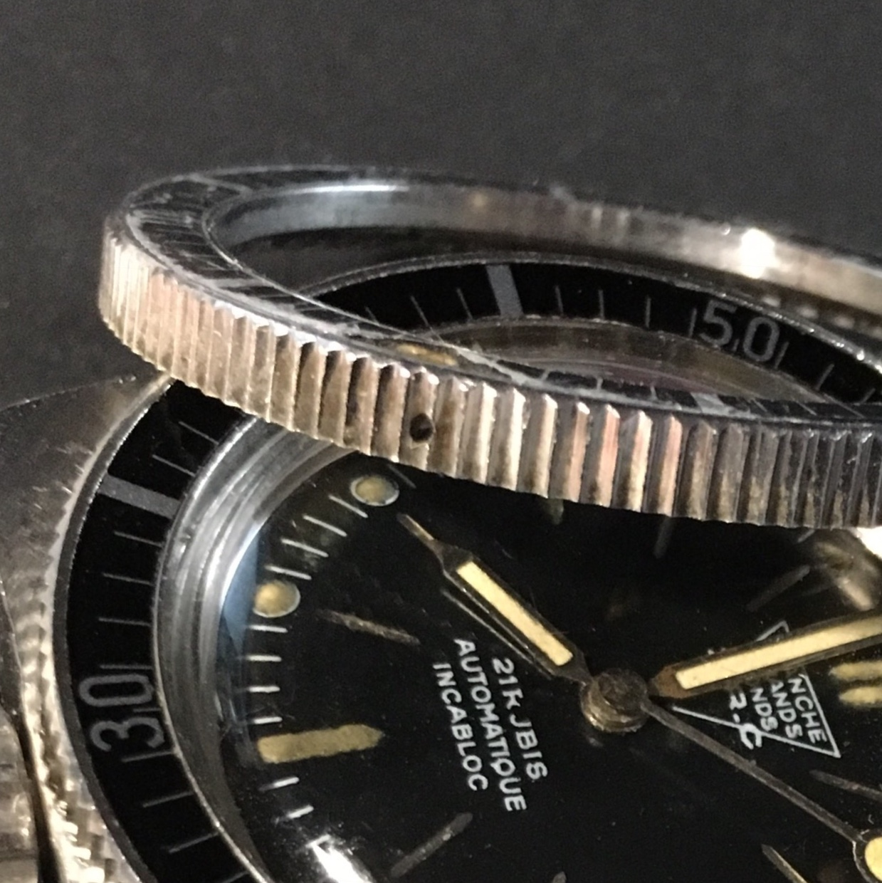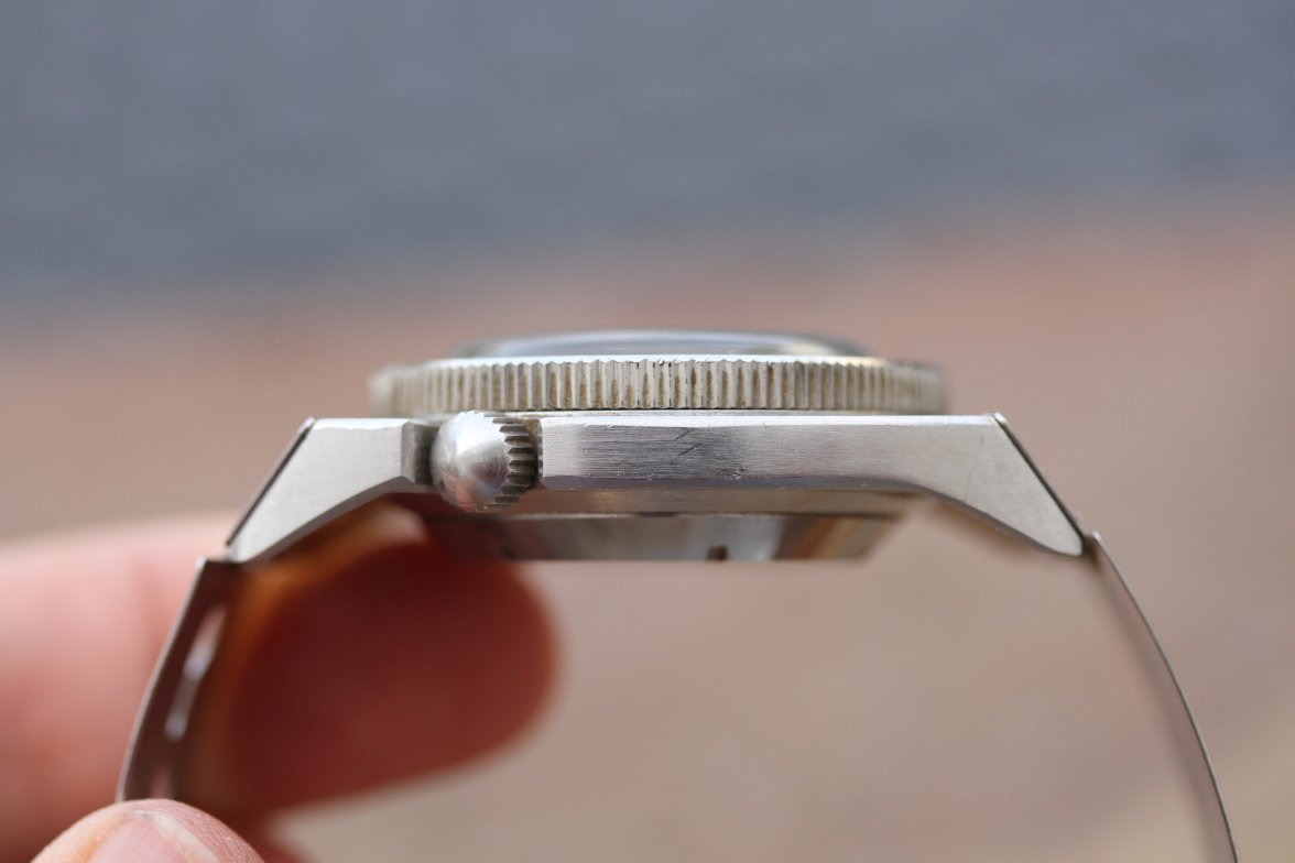 La couronne, toujours vissée en sens contra-horaire, est désormais fendue en son centre. Cette encoche a été ajoutée à la demande des plongeurs de la Marine nationale pour permettre de serrer et desserrer plus facilement la couronne à l’aide d’un… tournevis. Rustique mais efficace.