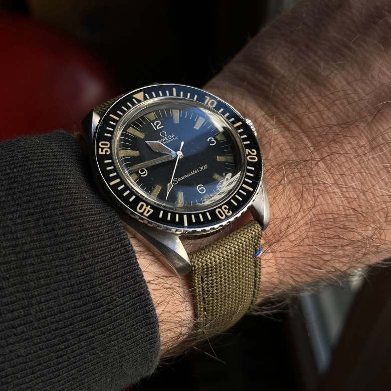 Depuis quelques jours, je teste également deux bracelets en Seaqual, cette toile de polyester intégralement recyclé, tissée à partir de déchets des océans. Le noir est allé sur mon Explorer, une montre à qui tout va, certes, mais qui trouve là, un brin encanaillée, une touche de sportivité sans être galvaudée.. Le vintage green, lui, s’est très naturellement accordé avec la patine d’une autre montre de plongée : l’Omega Seamaster 300 ref. 165.024, à laquelle il donne un coup de jeune tout demeurant respectueux de ses presque soixante ans.