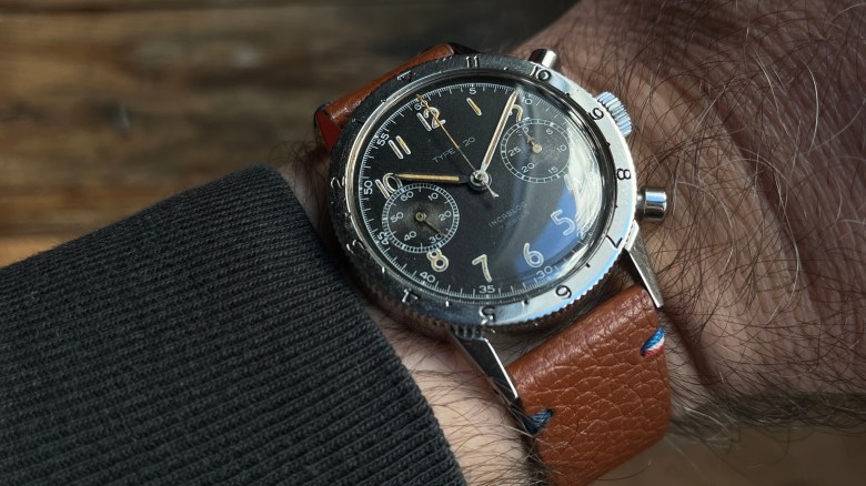 J’ai eu, plus tard, l’occasion d’associer un bracelet en cuir Douarnenez cognac à un chronographe Type 20 et il y est resté : le grain du cuir m’a paru bien répondre à la vocation utilitaire de cette montre tandis que la couture tricolore adresse un discret clin d’œil patriotique en écho à l’origine française et militaire des chronographes Type 20. (On s’amuse comme on peut, vous savez…)