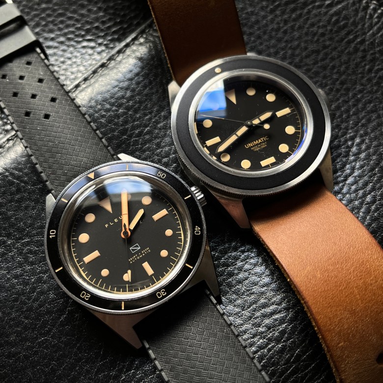 Ajoutons que ces index sont puffy (bouffis), comme on dit de ces gros points gavés de pâte au radium ou au tritium qui font tant pour le charme de certaines vieilles plongeuses et contribuent ici aussi beaucoup au charme du cadran de la Fleux, tout comme la teinte « old radium » du SuperLuminova. Ces tonalités ne sont pas sans rappeler la délicieuse Unimatic Modello Uno dans sa référence U1-B…
