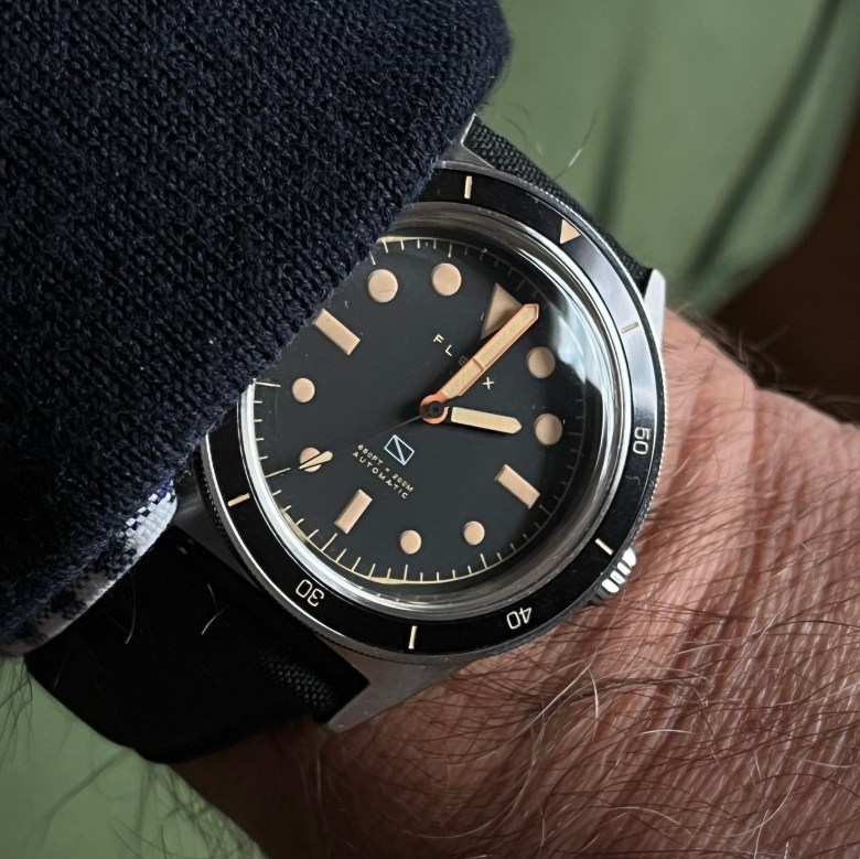 En définitive, la Fleux FLX-001 apparaît comme un exercice concluant. La montre est bien finie et agréable à porter dès que l’on troque le très rigide bracelet en Seaqual contre un cuir, un Nato ou un style Tropic, et rien à dire sur ses performances mécaniques. Mais ce qui fait vraiment la différence, c’est son design. Fleux n’est certes pas la seule marque à avoir élaboré un style mariant les accents nostalgiques et les traits résolument contemporains mais la FLX-001, plus encore que la FLX-002, de mon point de vue, est une alchimie particulièrement réussie en ce que les citations du passé sont convoquées au service d’une création moderne globalement cohérente. Avec la Fleux, on ne porte pas une montre qui fait semblant d’être ancienne et patinée : on porte bien une montre de 2023 dont le design incorpore avec intelligence ce qu’on aime dans les vintage.