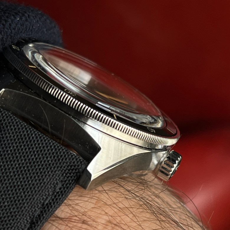 Puis vient le cadran. Une vraie réussite, ce cadran : un fond noir soyeux, légèrement passé, de fines écritures dorées, le chemin de fer qu’on adore chez les antiques Submariner et cette étonnante asymétrie des index. Pour rester dans le jargon Rolex, c’est Maxi Dial au nord, Radial Dial au sud, en quelque sorte… et le résultat est très convaincant. Par une étonnante alchimie visuelle, on a presque l’impression que ces index sont animés d’un mouvement mystérieux. (Même à jeun, oui.)
