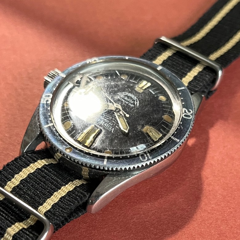 Currently relaunched en Italie sous la dénomination VeriWatch, the VeryWatch brand marketed some interesting models in the 1960s, including this diver’s watch produced in partnership with Squale. Dating from around 1968, it stands out for its rare and very elegant asymmetrical case.