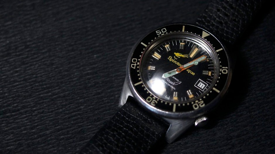 Séance photo avec cette plongeuse atypique des années 1960, commercialisée sous le label Aqualung (marque internationale de la Spirotechnique) avec un mouvement FELSA Bidynator.